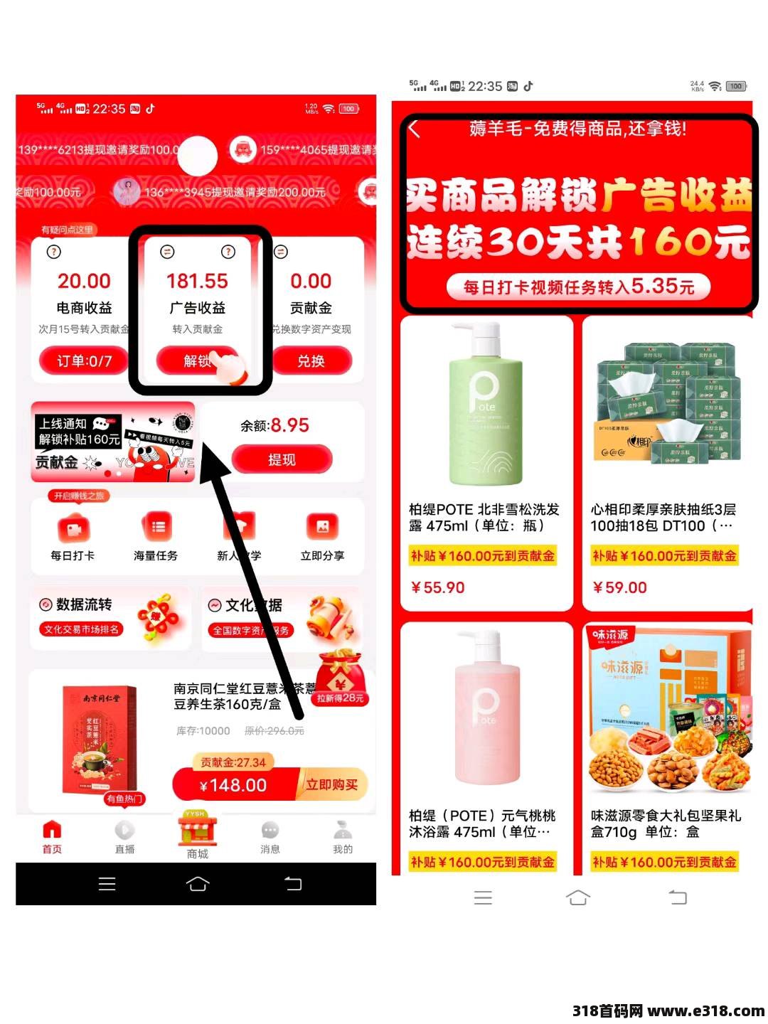 自撸:购买一件商品50来块 每天看完广告获得5元 一个月150元
