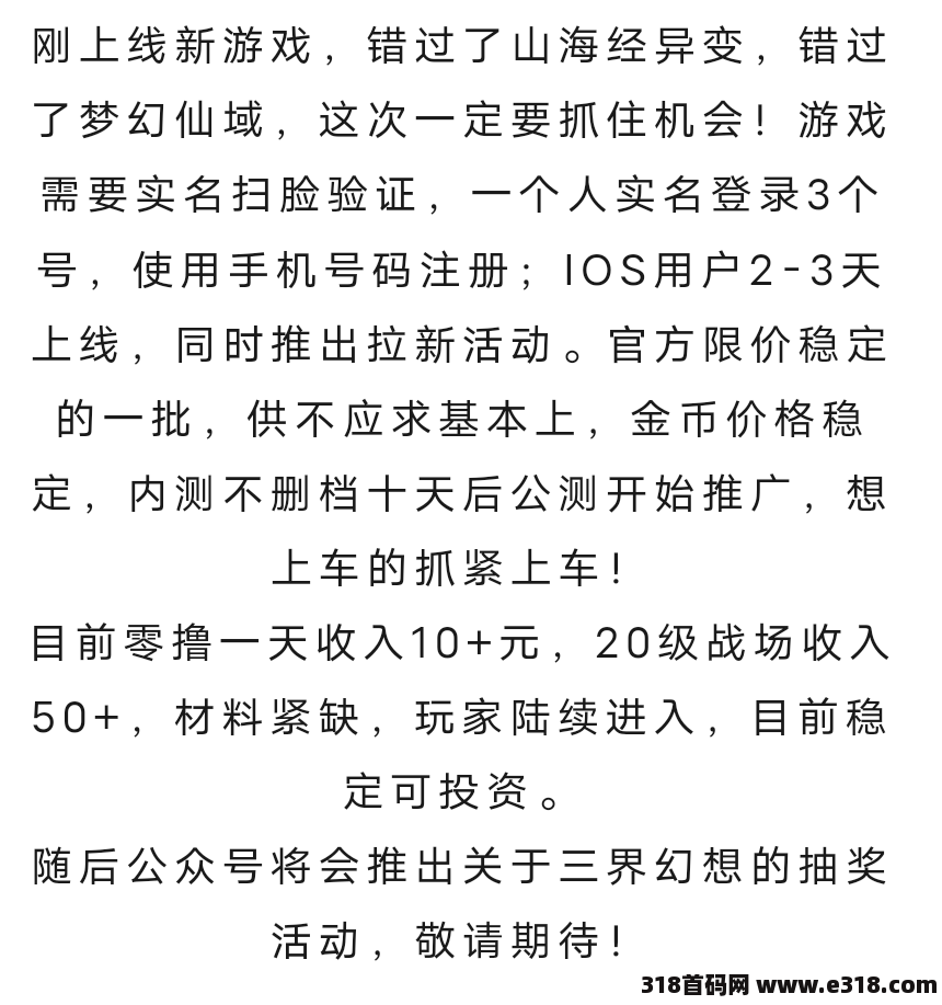 《三界幻想》梦幻仙域玩法,内测不删档。昨日刚刚上线,市场上绿石头都靠抢,官方限价稳定的一批,供不应求基本上,金币价格稳定,内测不删档十天后公测开始推广,想上车的抓紧上。内测期间升级快,金币我回收,金币1元左右一个。资源都回收,材料供不应求。
