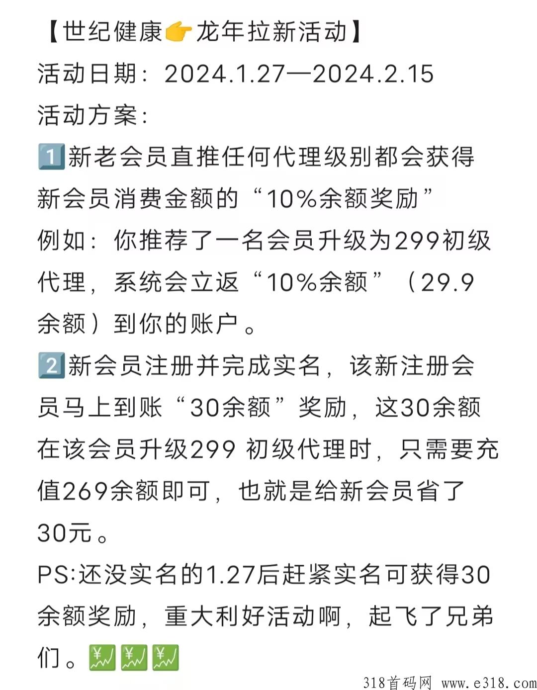 2️⃣新会员注册并完成实名,该新注册会员马上到账“30余额”奖励,这30余额在该会员升级299 初级代理时,只需要充值269余额即可,也就是给新会员省了 30元。