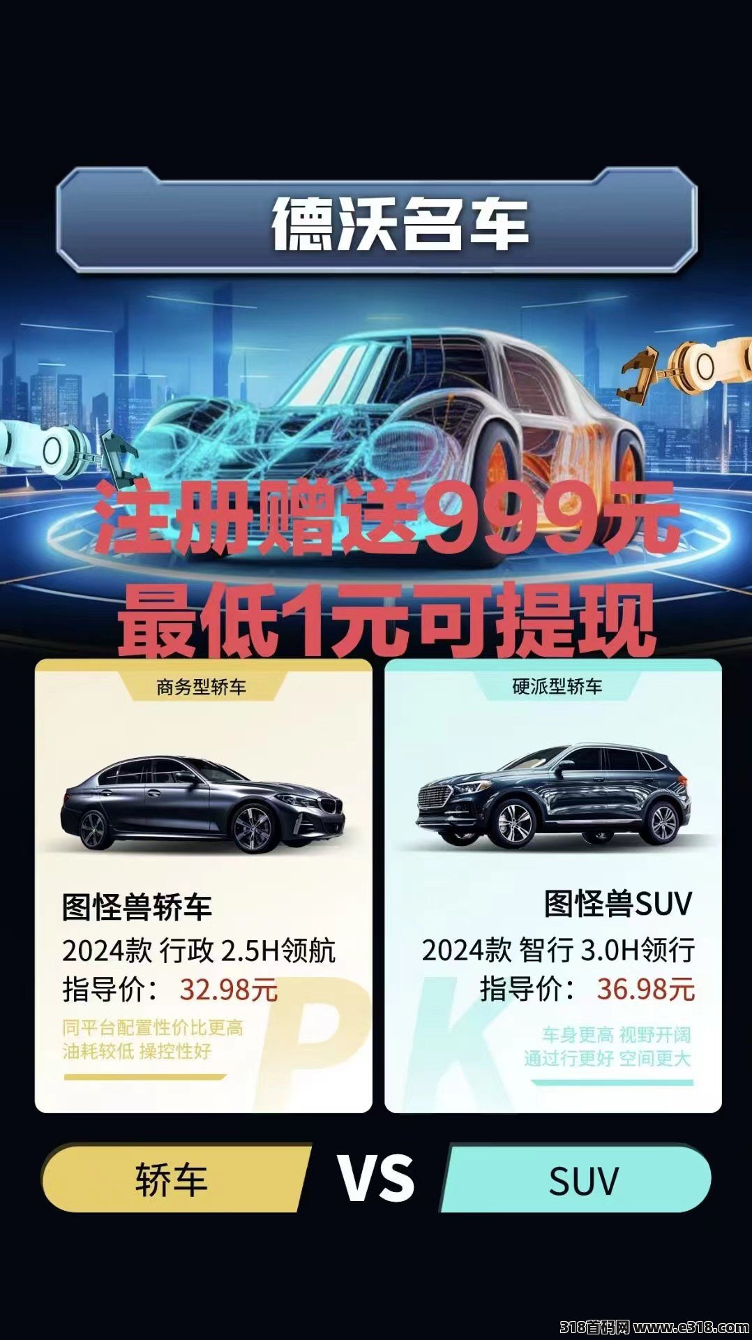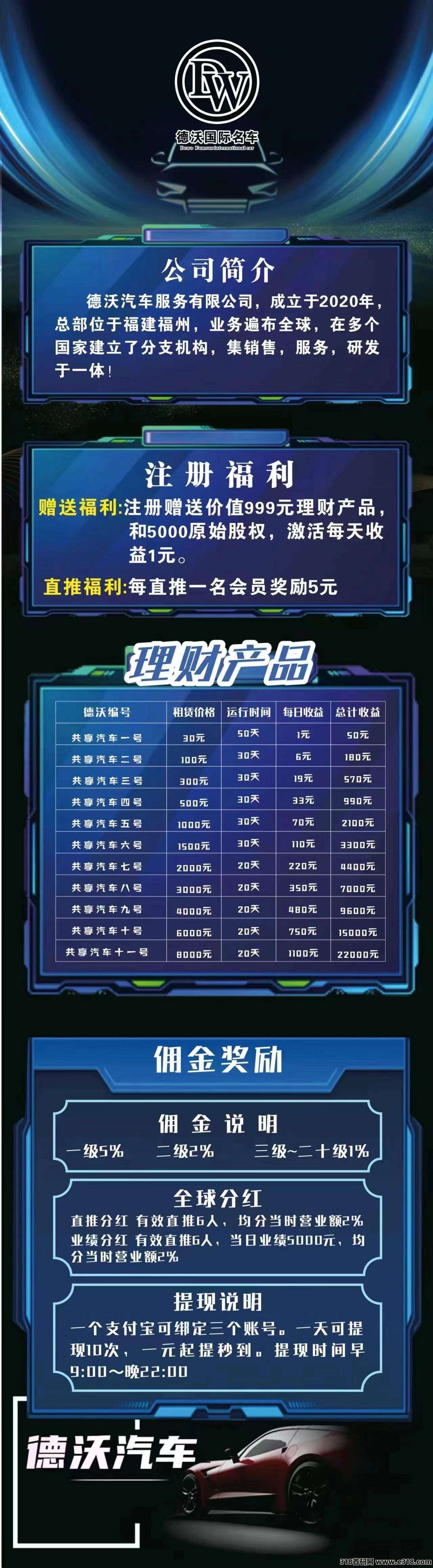 德沃汽车首码,注册就送999理财产品和5000原始股权,每天收益1元! 每直推一个会员奖励5元