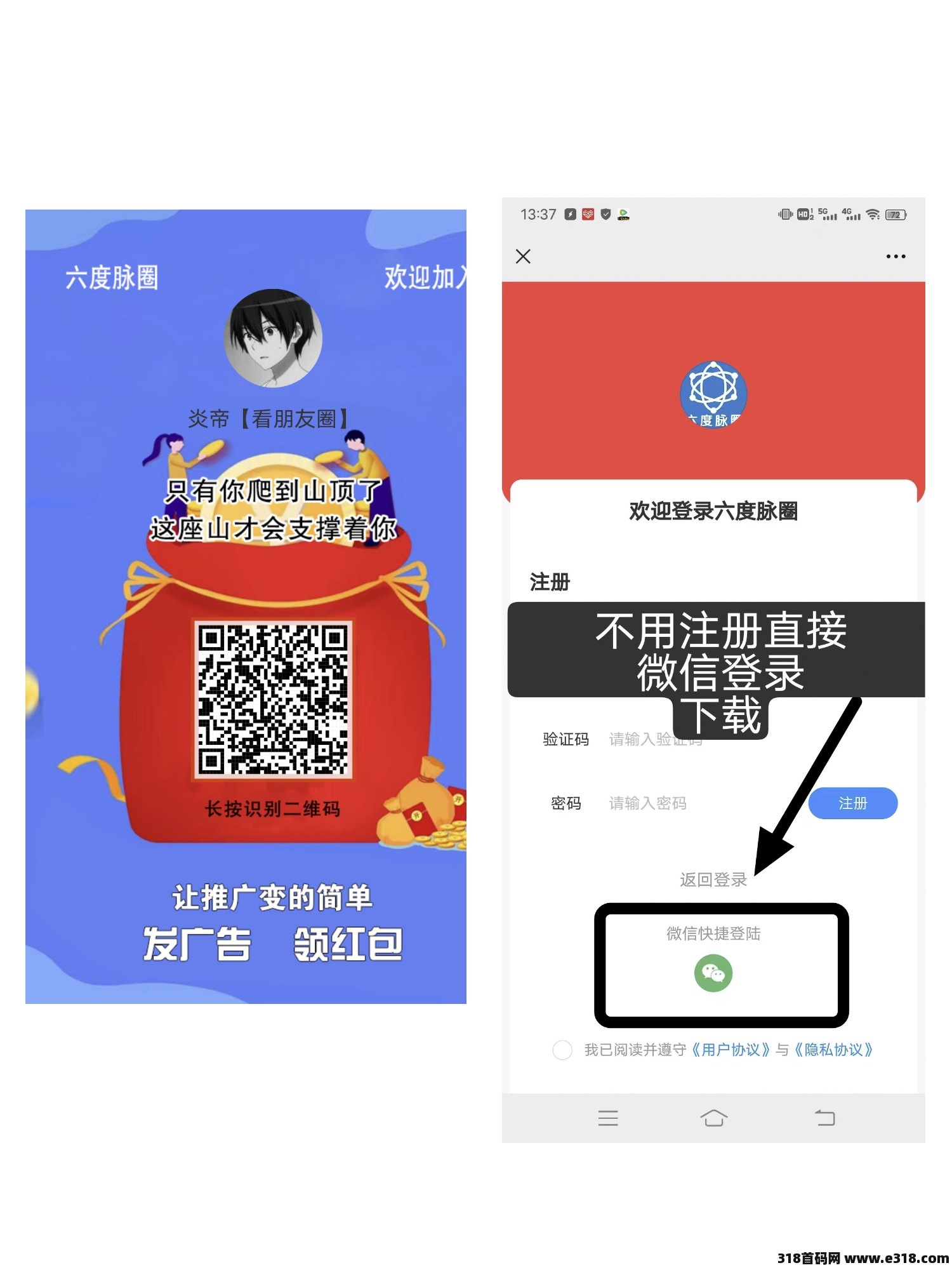 首码六度脉圈,每天领红包,分虹,直接微信登录不用注册,0.3起提。
