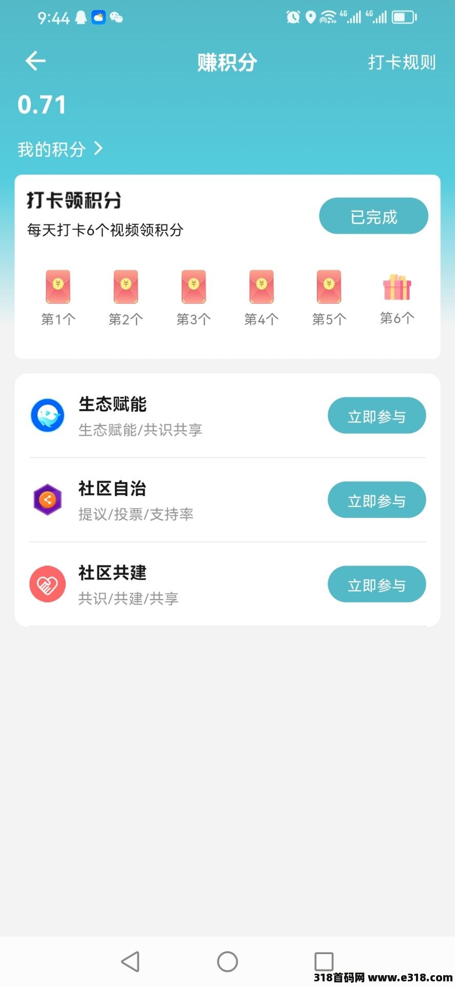 每日任务:免费实名后,点击我的→赚取积分→每天6个视频领积分