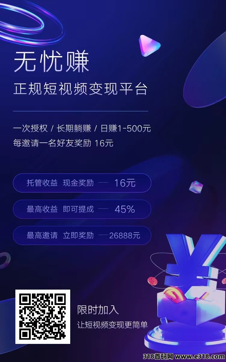 无忧赚是一款不用动手操作的短视频代运营变现平台,0投入,注册即使用,普通人也可通过短视频赚钱!平台负责制作内容,广告对接,而你自行授权短视频账号,无忧赚平台根据您的账号授权后上传正规作品发布到用户授权的抖音账号上,通过作品引导转换获取收益,无忧赚平台按账号作品播放点击广告,转化分配收益。