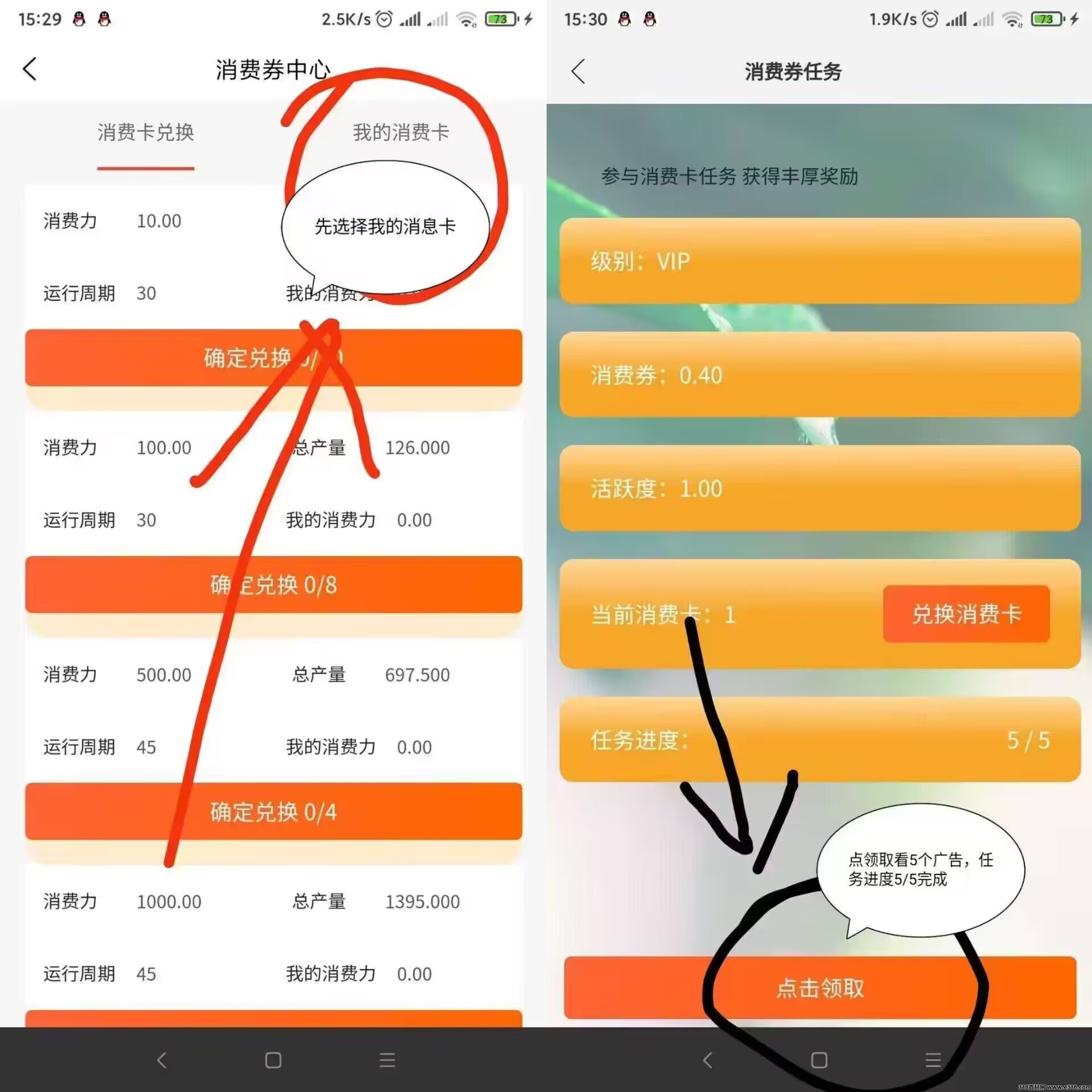 任务 点我的消费卡领取 看5个广告。领取收益。