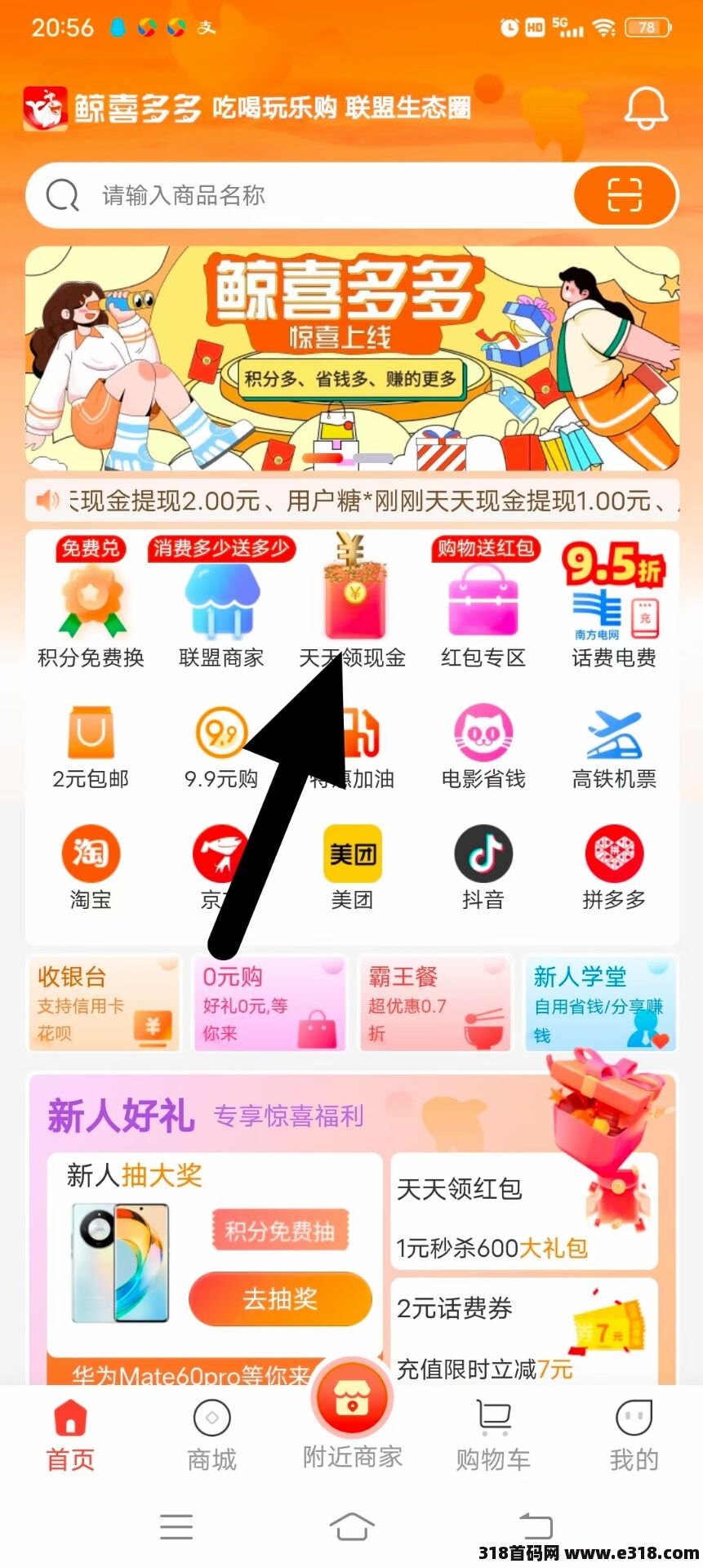 首码鲸喜多多,免费领红包,先点我的右上角齿轮免费实名,首页:点击天天领现金,免费领红包,点加群享福利加入官方群