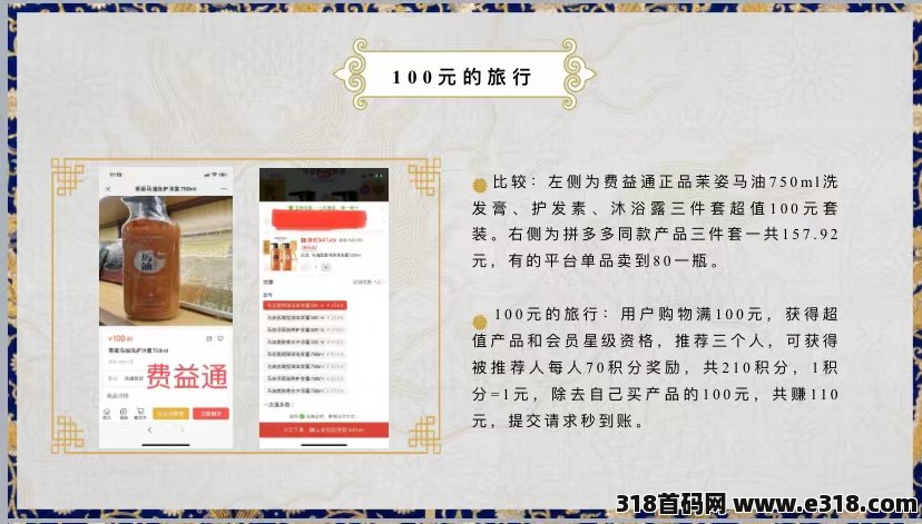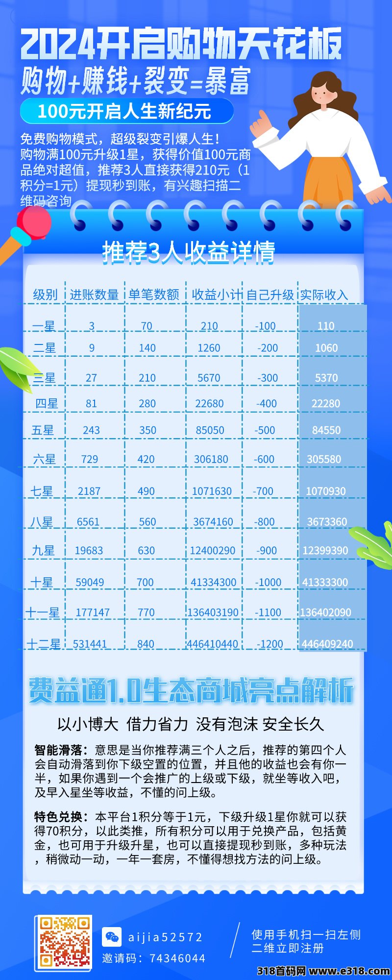 参与费益通需要购买100产品进场,当然,同时获得品质等同于100元的产品,和星级资格,星级一共分为12级,每升一级可以获得升级的下一代收益,而且升级全部用积分就可以,1积分=一元,自己购买100元产品,然后推荐3个人,每个人可以获得被推荐人70积分,就是210积分,减去自己买东西的100积分,赚110积分,可以立即申请提现,秒到账,相当于免费购买产品升星机会,每个星级收益不同,请看下图