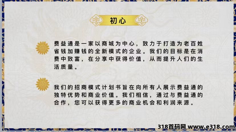 费益通是一家以商城为中心,致力于打造为老百姓省钱加赚钱的全新模式的企业。我们的目标是在消费中致富,在分享中获得价值,从而提升人们的生活质量。