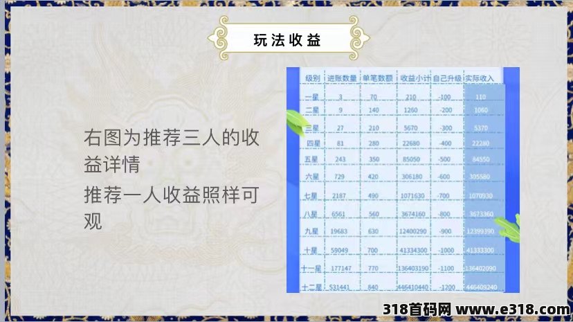 3、 每位星级会员只需要推荐三个新会员即可,如果能力好推荐的人多,从第四个会自动滑落到下级空置的位置,并且滑落的会员以及他所推荐的会员都跟你有关系,都会获得收益,有几个有能力的上下级,你会赚的爽歪歪。
