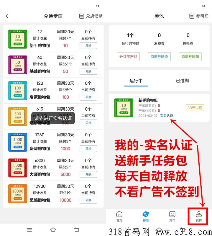 2,免费实名认证自动送初级任务包(实名无需人脸,不收费)