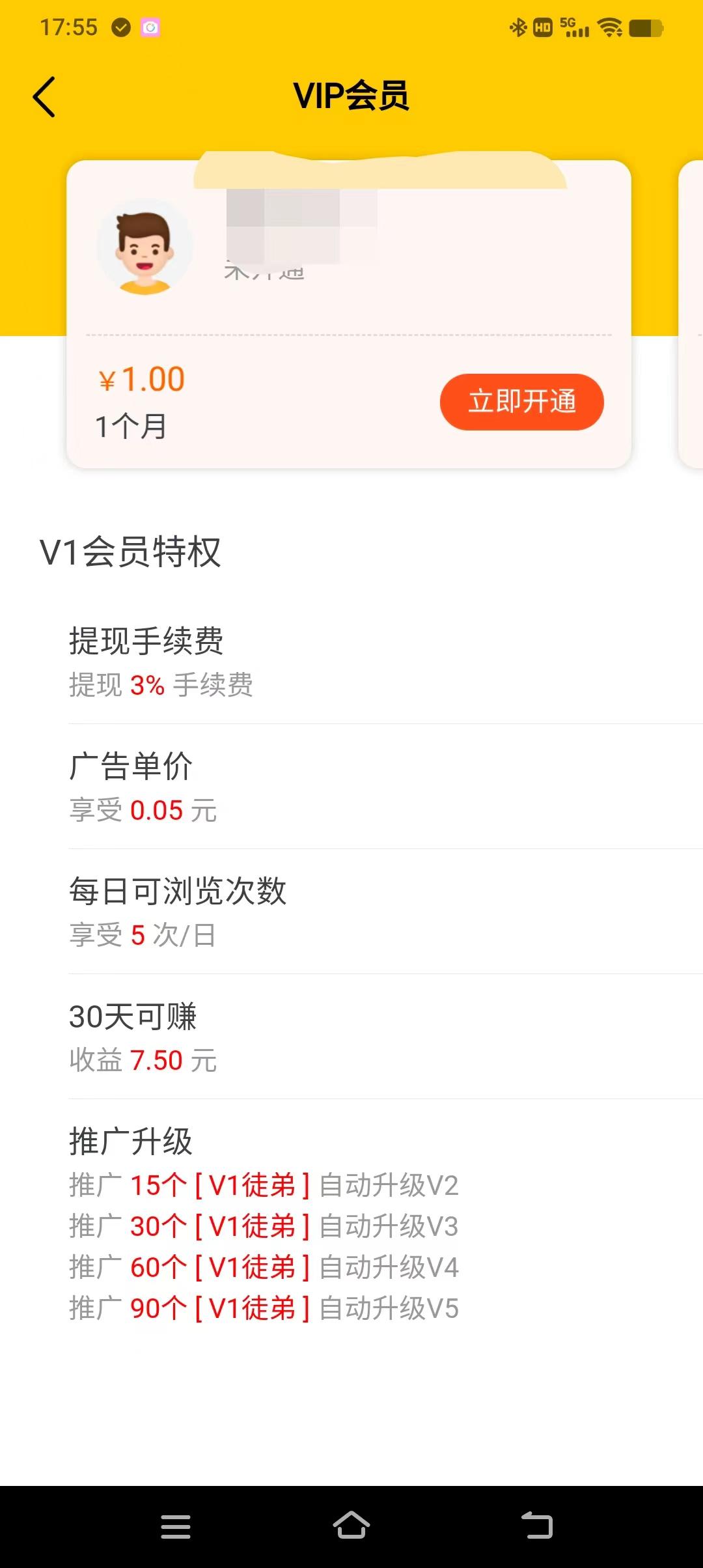 推广升级至VIP5每天10广告收益3元。直推10%,间推5%广告收益提成。