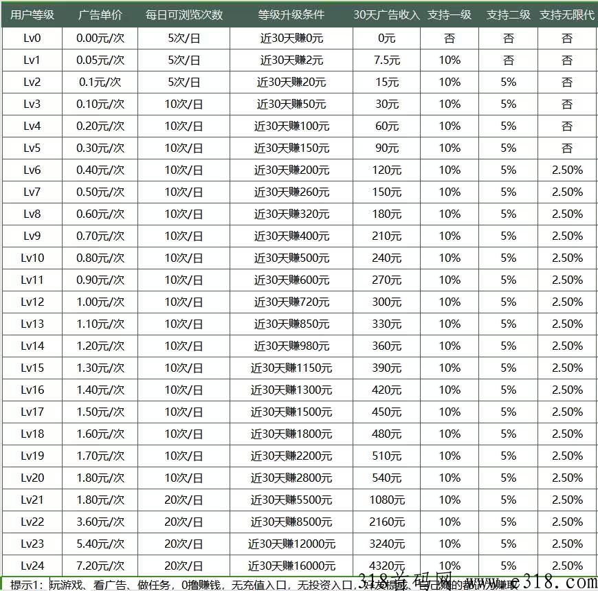 推广升级至VIP5每天10广告收益3元。直推10%,间推5%广告收益提成。