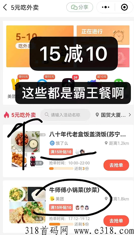 5元就可以吃到几十的外卖,自己点外卖可以省,分享身边朋友点,你也有收益。帮大家省钱的项目,都好推!