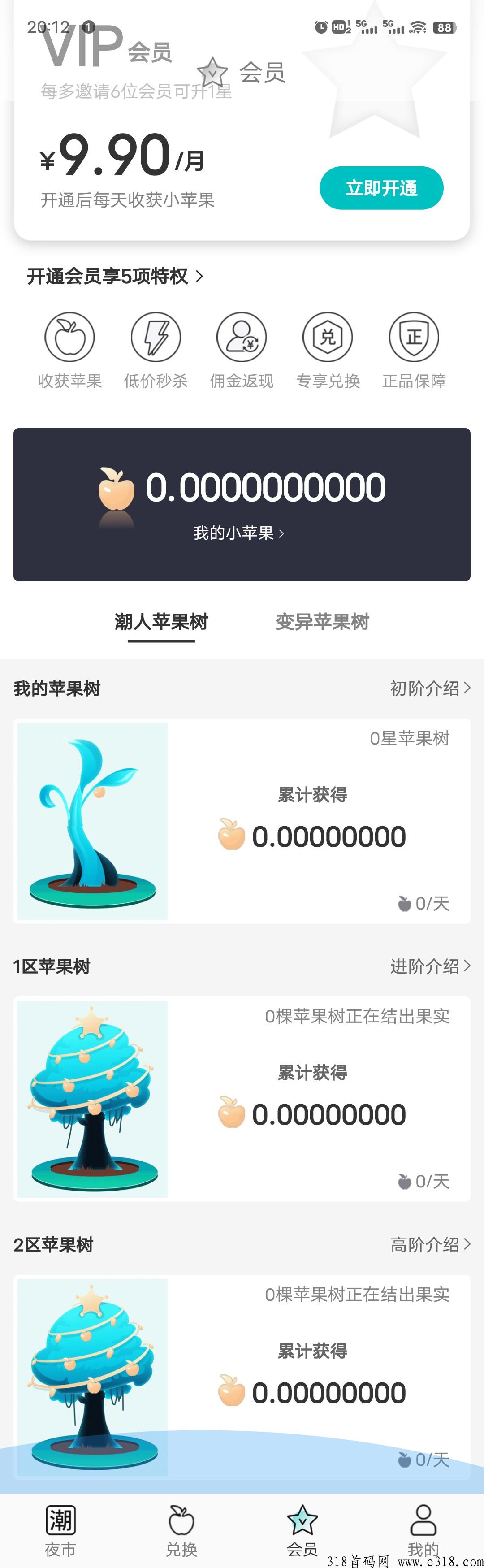 一、实铭后9.9元开通会员,激活果树,每天产0.03个苹果