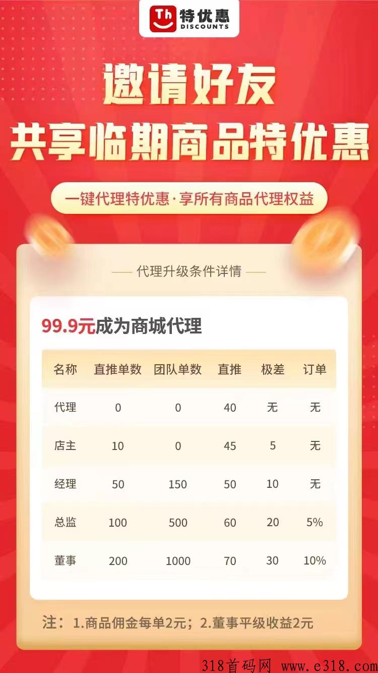 特优惠商城首码4月9日2点刚上线,简单粗暴,收益高,招募第一批团长