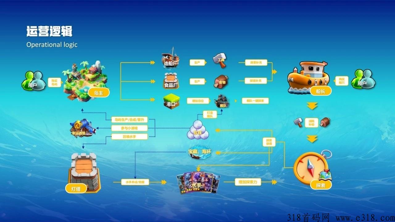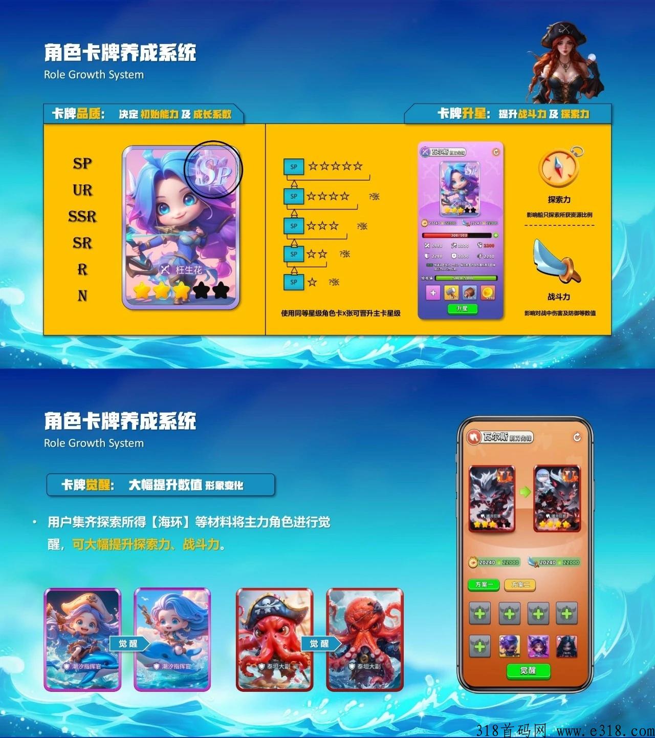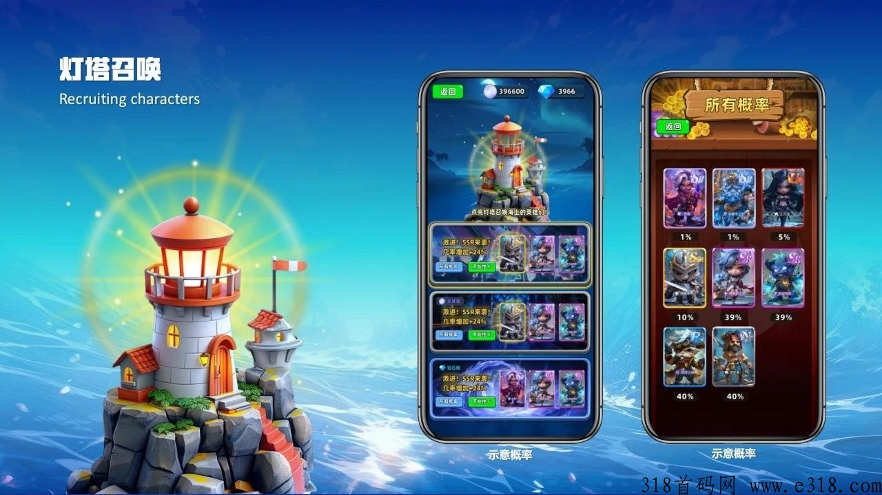 水手养成,灯塔可以去抽取水手盲盒,抽取水手盲盒可付费、钻石、珍珠抽取,水手盲盒里有、战士、骑士、法师、射手、刺客、牧师六大阵营,不同等级N卡、R卡、SR卡、SSR卡、UR卡、SP卡,星级1-5星,低星水手可升级高星水手;高星水手卡和高等阶卡后续可挂集市)。