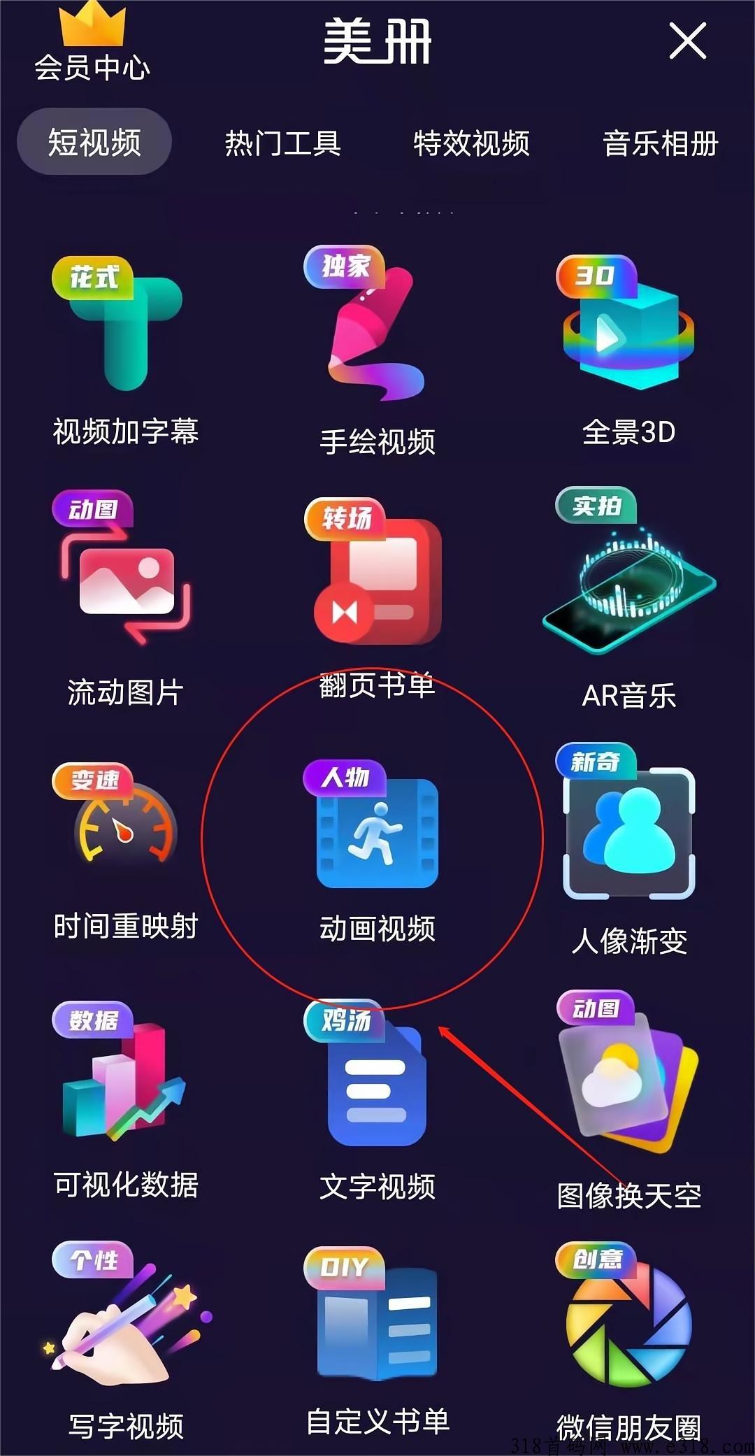 打开美册app(自行下载),选择动画视频,里面是自带沙雕视频的素材的,下载好后打开软件点击制作!