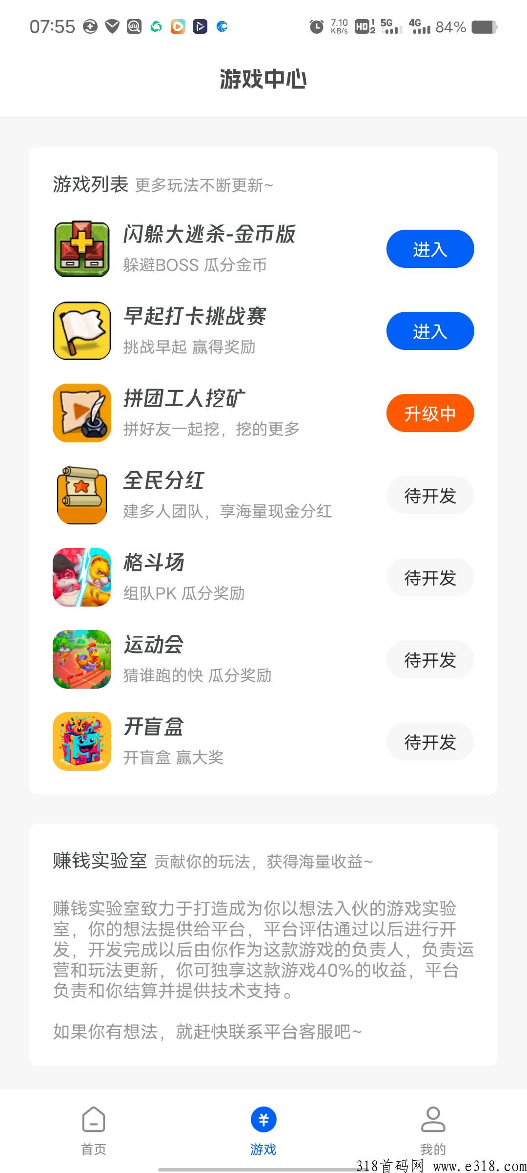 初次还可以在游戏中心玩,大逃杀,打卡挑战赛,拼团,全民**,其他游戏在开发当中