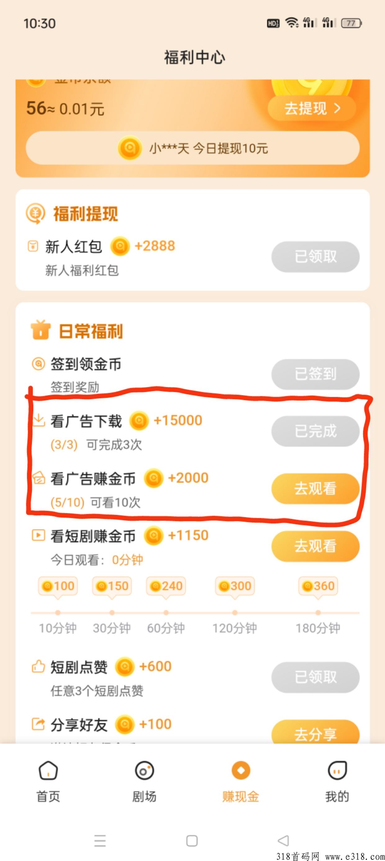 91短剧,比起市面上大部分需要养机的广告平台,这个平台就非常适合新手无脑点广告,也就花十来分钟就看完(那个2000金币任务价值两毛钱可以省时间不看),一万金币等于一块钱,也就是单号每天十来分钟保底1.5元至少,为了提高效率,多台手机多个号一起看,收益就大大增加了