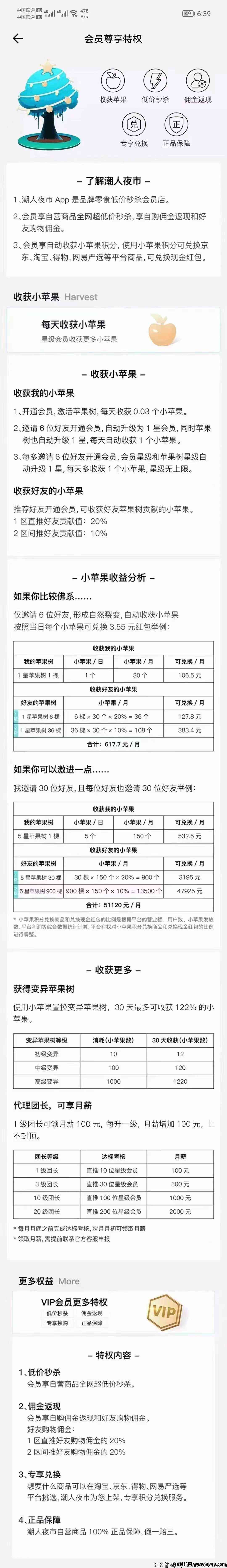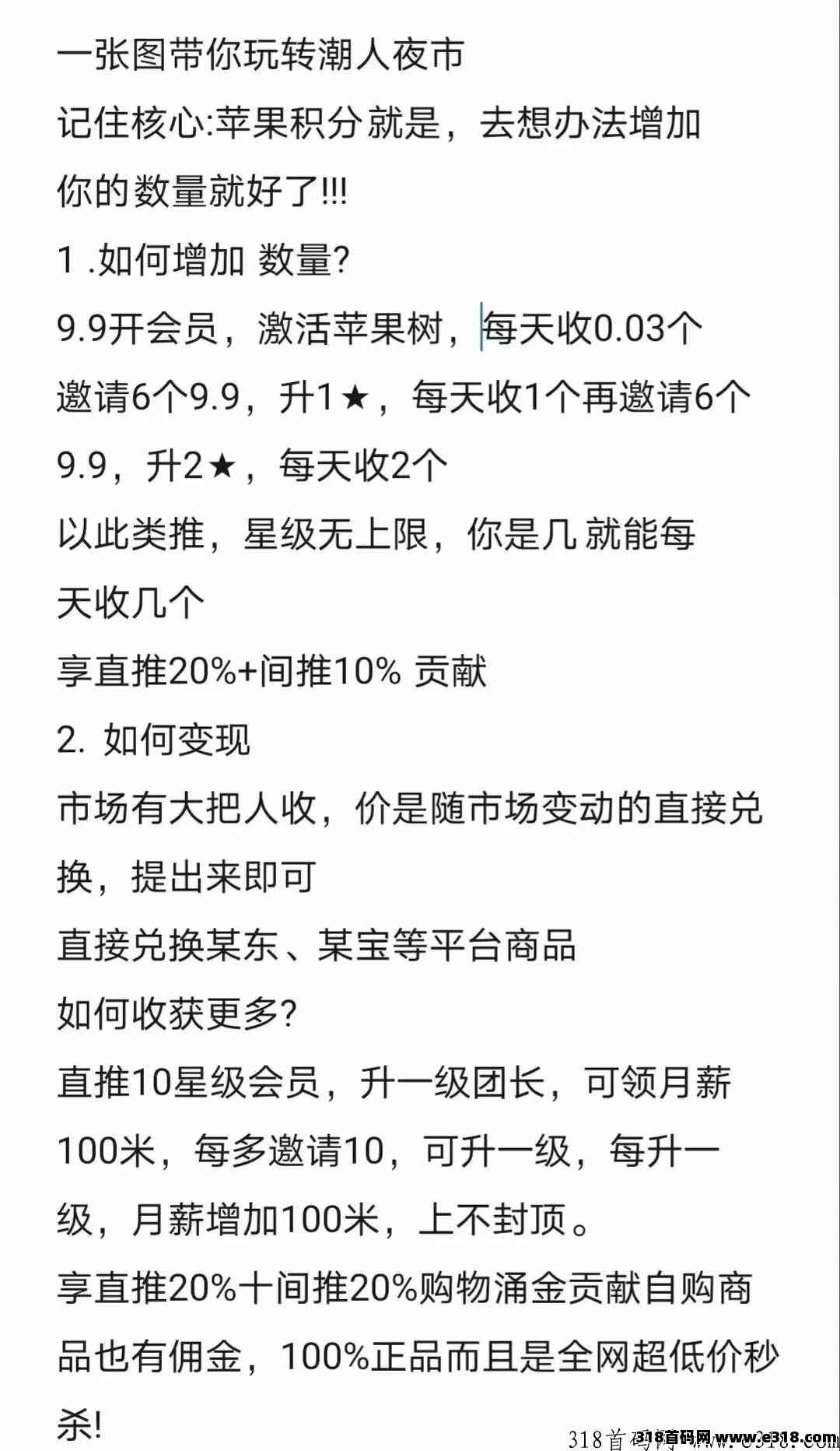 潮人夜市:购物商城+果树种植双模式,双收益,团队可层层受益!苹果可兑换商品全网内测,5月6日上线,火速注册占位。