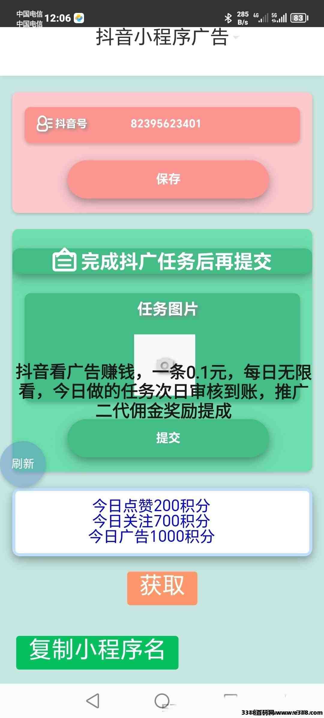 这是一个全新的抖音小程序体验,将观看广告与收益完美结合。只需动动手指,就能在享受内容的同时,累积财富。无需任何投入,只需积极参与,每日都有可能实现稳定的收益增长。