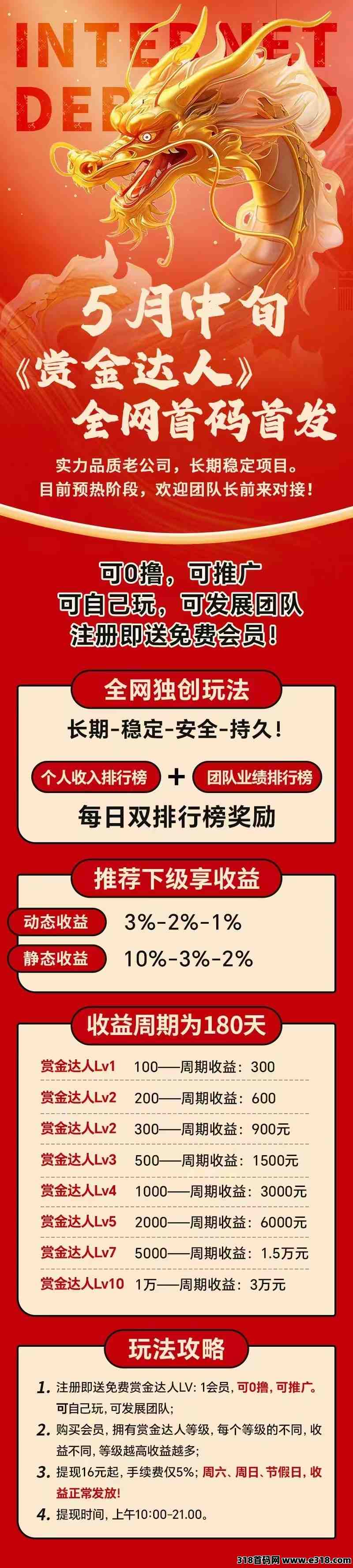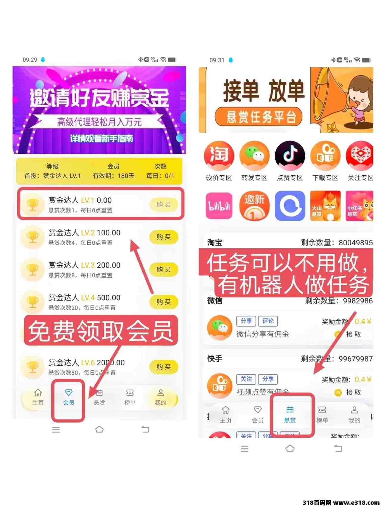 赏金联盟首码注册即送免费赏金达人LV1会员,可0撸,可推广。可自己玩,可发展团队;