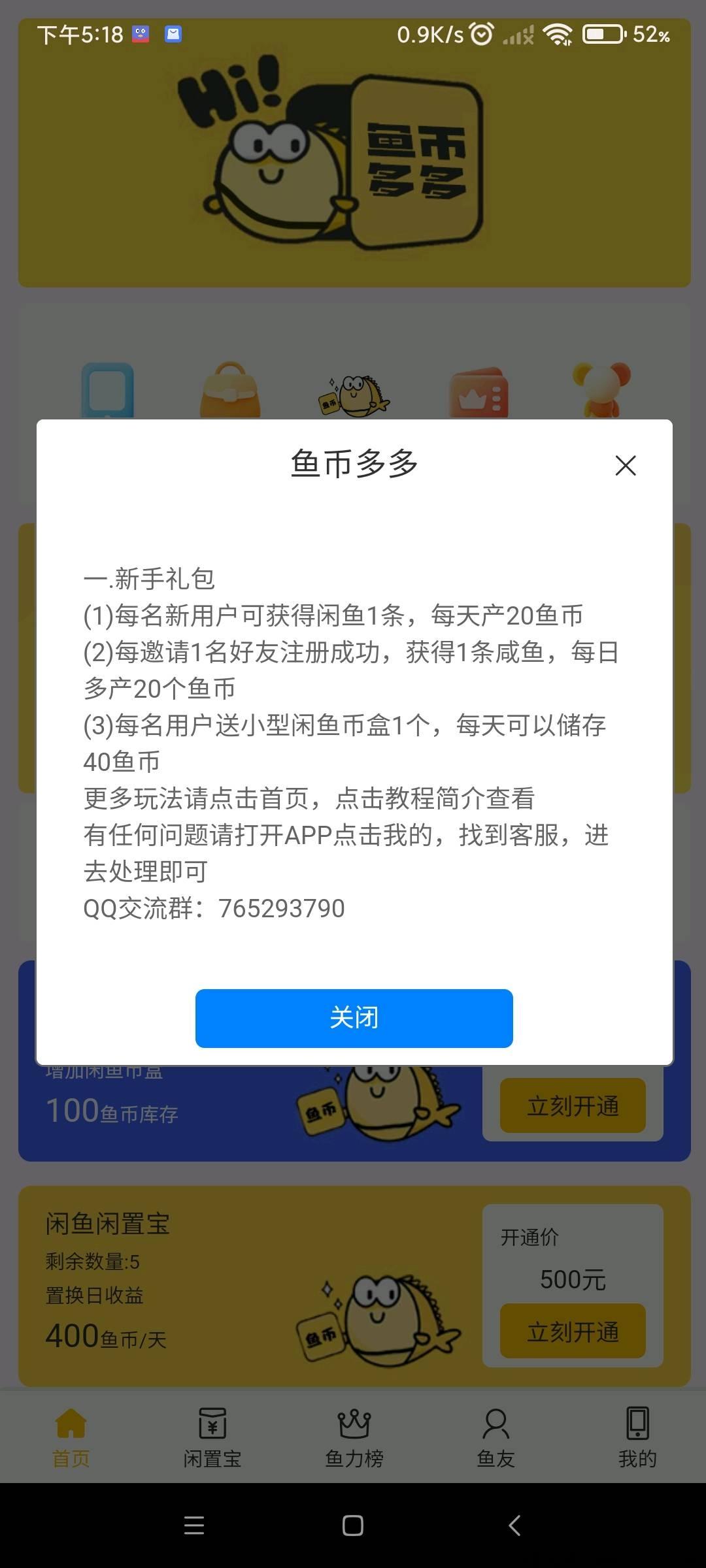 2.每分享一名好友加入,获得闲鱼一条,每一日可以多产生20个鱼币!