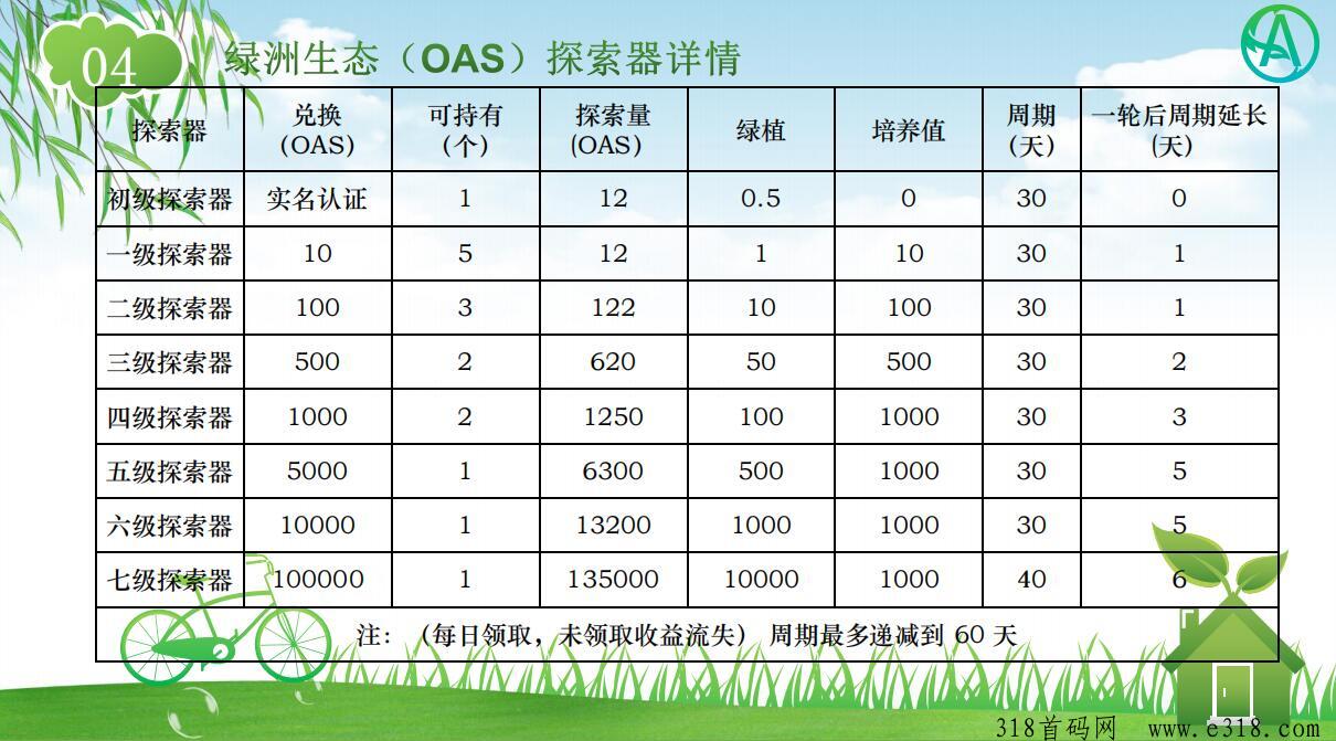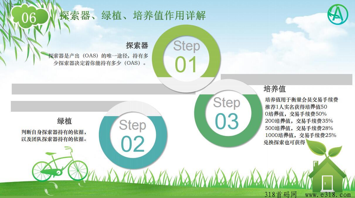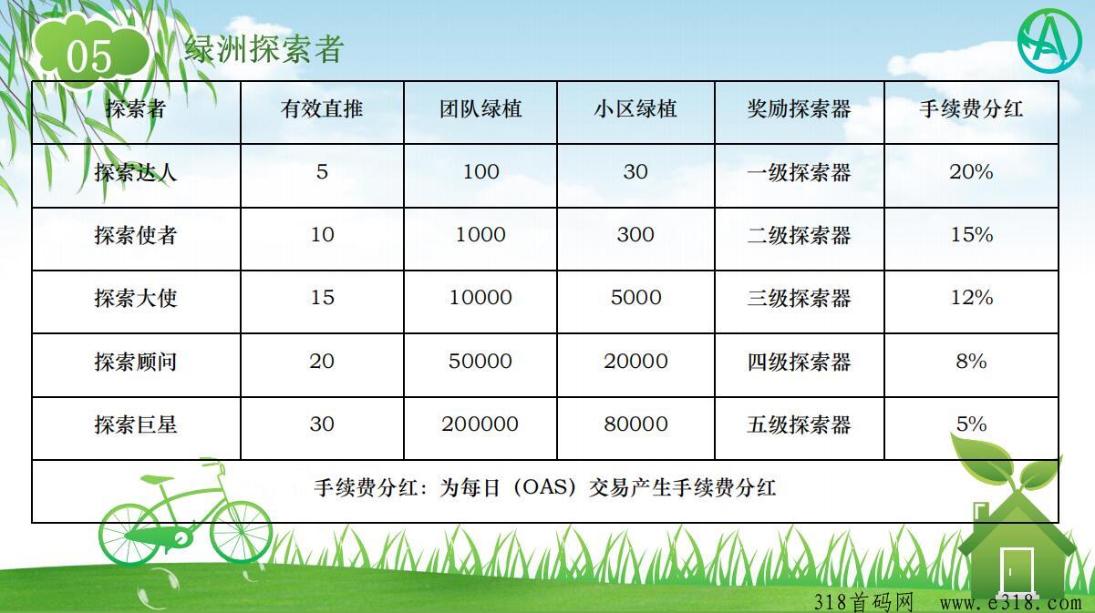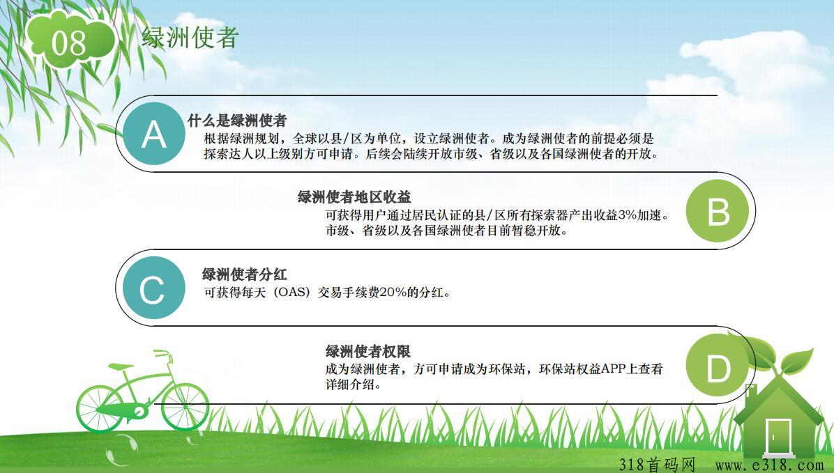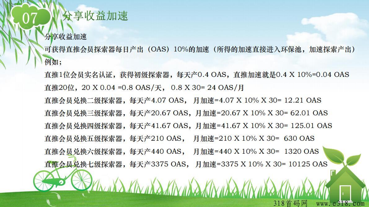 推广环保,共赢未来:成为绿洲的推广大使,你将获得直推会员探索器每日OAS产出的10%加速。这份加速将汇入环保池,根据你的贡献值公平分配,部分还将被销毁,以保持绿洲的生态和谐。