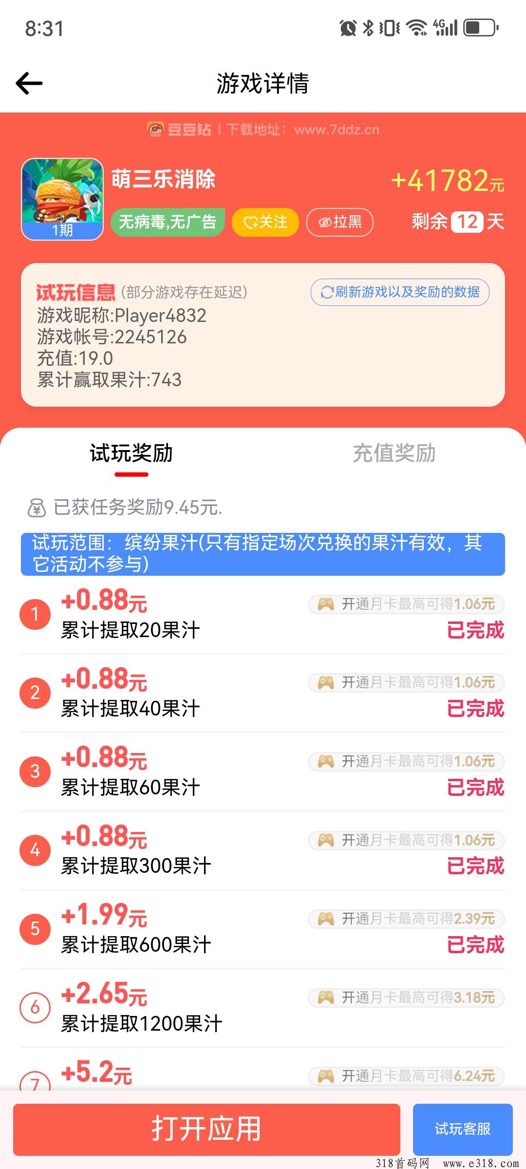 目前还剩二十多万金币,再玩估计给吃完了,留着明天继续玩!算下收益和成本,成本6+13=19元,收益4.2元(支付宝已经提现到账)+豆豆钻目前试玩收益9.45元+萌三乐消除平台还剩2103果汁+七日投资礼包剩余的500果汁,哪怕后续金币玩完一点不赚,目前也赚了20元!此类游戏都可以长期玩下去,每天签到攒金币,同类型的游戏我都是稳赚二百多!就看你有没有耐心玩!