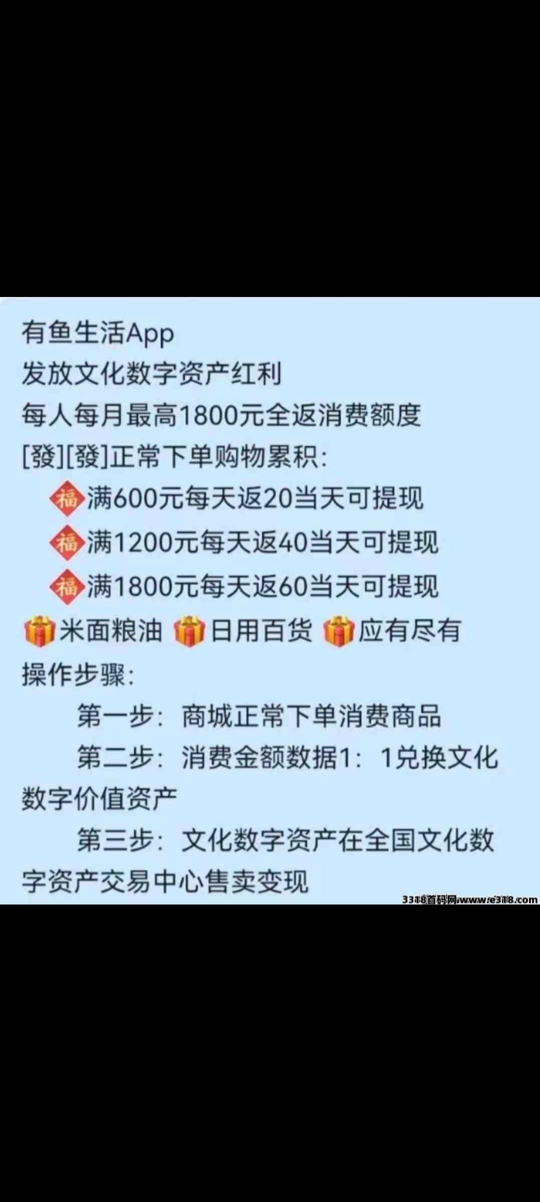 有鱼生活,加入它你就跨入了未来几十年数字经济红利的门槛,大过几十年前的出海经商,大过之前的房产经济,这是一个新机遇,新潮流,人人都可参与,不信的话可以联系我,运营一段时间你看看,一个真正的正规平台,拥有正规公司,全称国中数字集团 ,可以考察,不用担心跑路不跑路,平台已拥有四千万注册量,运行两年多,真正的时代红利,风口项目,绝对可以赚钱,而且很有保障,现在我月入过万,可以当做副业。