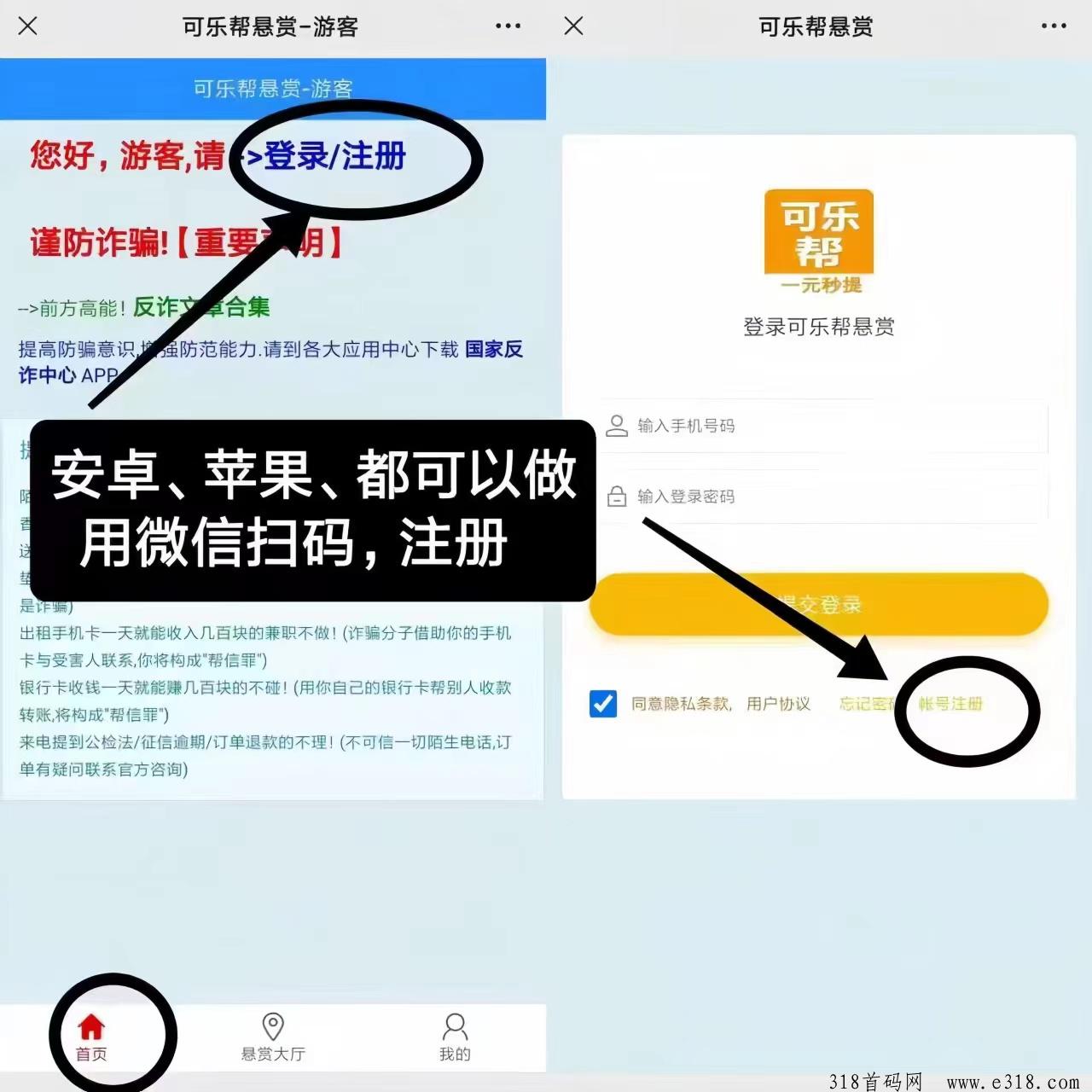 ①:薇信扫码进入页面,新用户先点击注册,然后登陆!