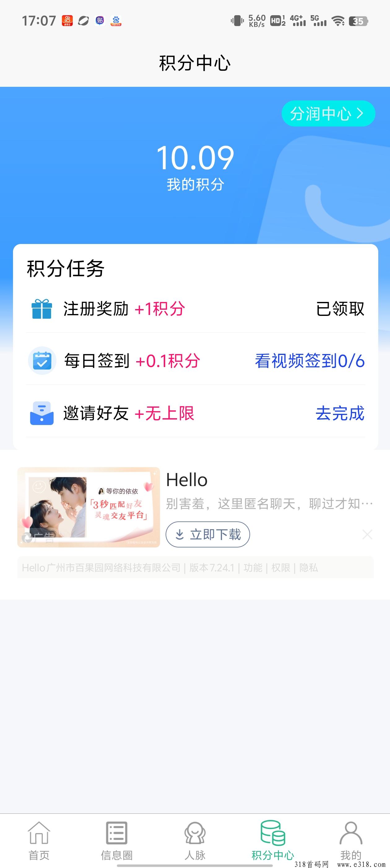 8月5日上线,广告**盘,注册送1积分,每日6个广告签到获得0.1积分,1积分每日分0.3米,10积分每日分3米,100积分每日分30米,持积分越多每日**越多,推广二代佣金奖励。