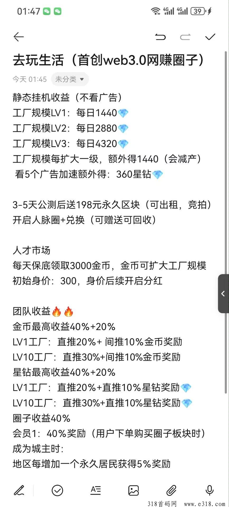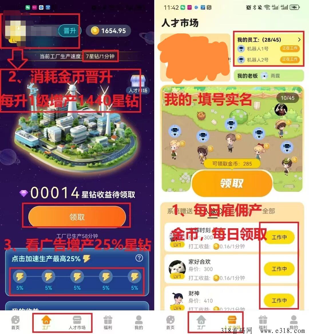 金币可以用来升级工厂,工厂等级越高,所产的星钻收益越高,可雇佣的员工数也越多,可以邀请好友来帮你打工产收益,但是工厂每升一级,消耗的金币就会越多,有精力的玩家可以选择去做每日的广告任务得金币,或者邀请好友(人脉)享受团队收益和加成!