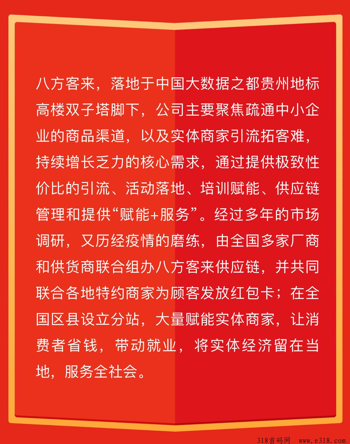 中国好项目:“八方客来供应链营运中心”黔味出山,数据先行。从人代言,不负时光,不惧未来,为梦想面战。我们欢迎您的加入。