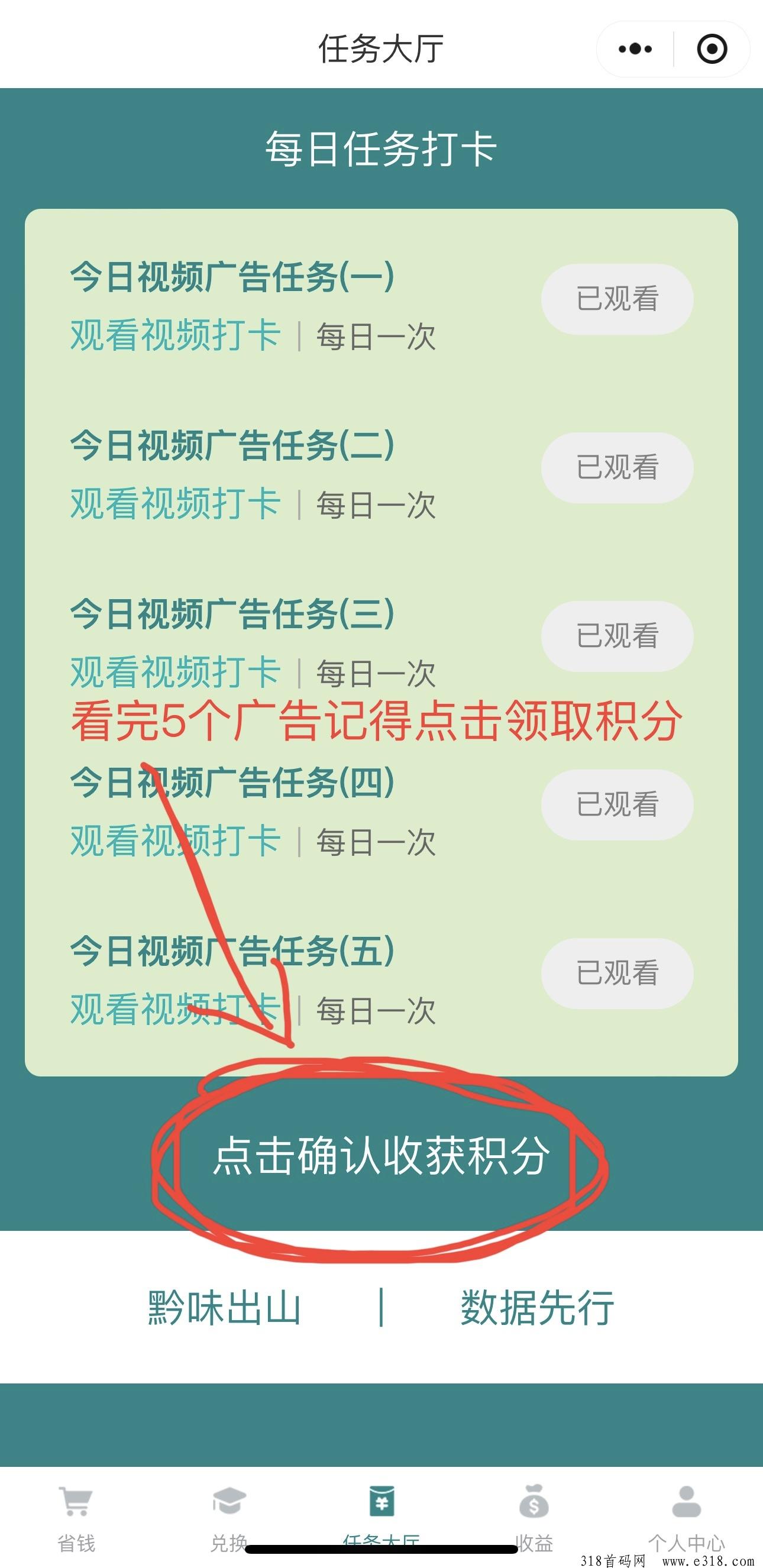 每天只需2分钟分钟完成5个广告任务,即可获得积分奖励。