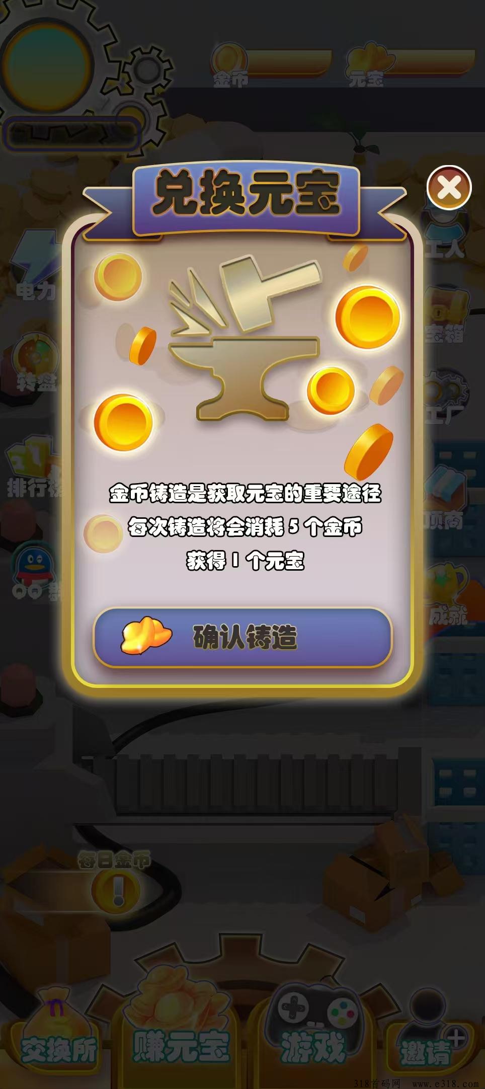1、注册即送一名普通工人,每天观看6广告增加电力,生产金币,5金币铸造一元宝。邀请10个好友额外送一名普通工人。