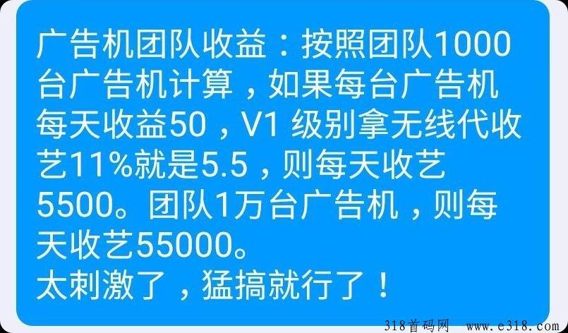 星火集团旗下新平台,广告机矩阵大项目已经开始内排领导人,年前上齐10个广告机APP,用广告机看广告,每一个广告APP每天收益至少10元,10个APP每天都是100元!