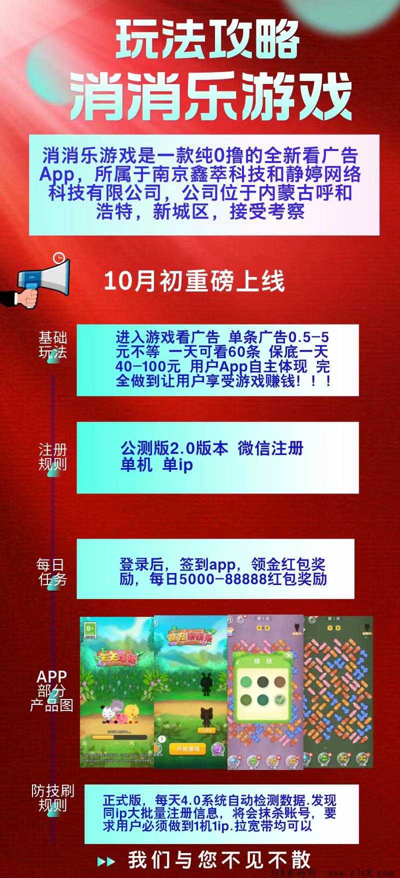消消乐游戏是一款纯0撸的全新看广告 App,所属于南京鑫萃科技、静婷网络科技有限公司,公司位于内蒙古呼和浩特,新城区,接受考察 10月初重磅上线 基础进入游戏看广告单条广告0.5-5元 一天可看30-60条保底一天 40-100元用户App自全体现完 全做到让用户享受游戏赚钱!