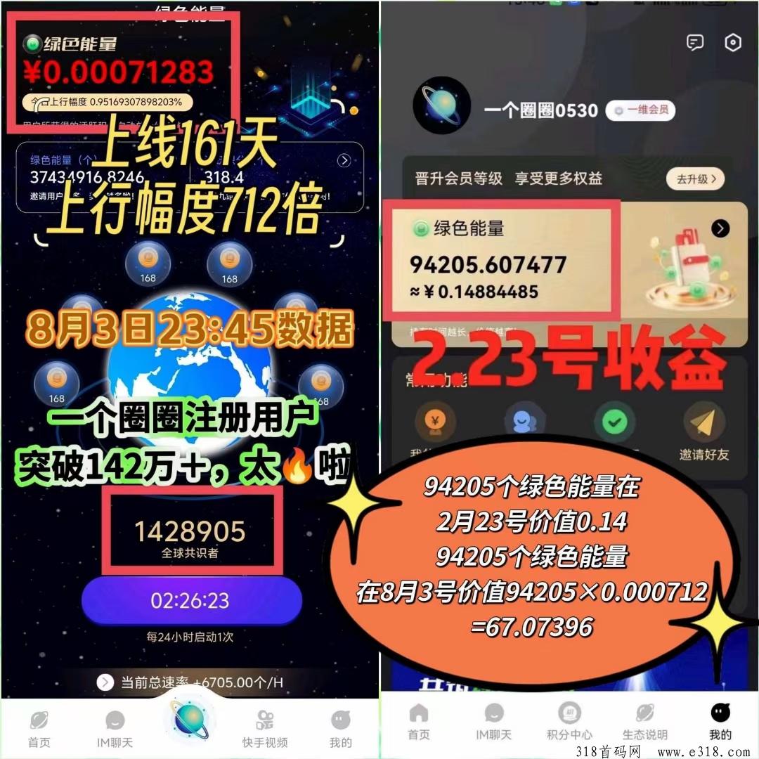 在一个圈圈平台,用户每天利用碎片化时间,通过观看广告、刷短视频,即可参与生态企业红利的长期分配,实现流量收益变现与商家帮扶等多重目标,从而获取绿色能量积分,进而转化提现为实际收益。
