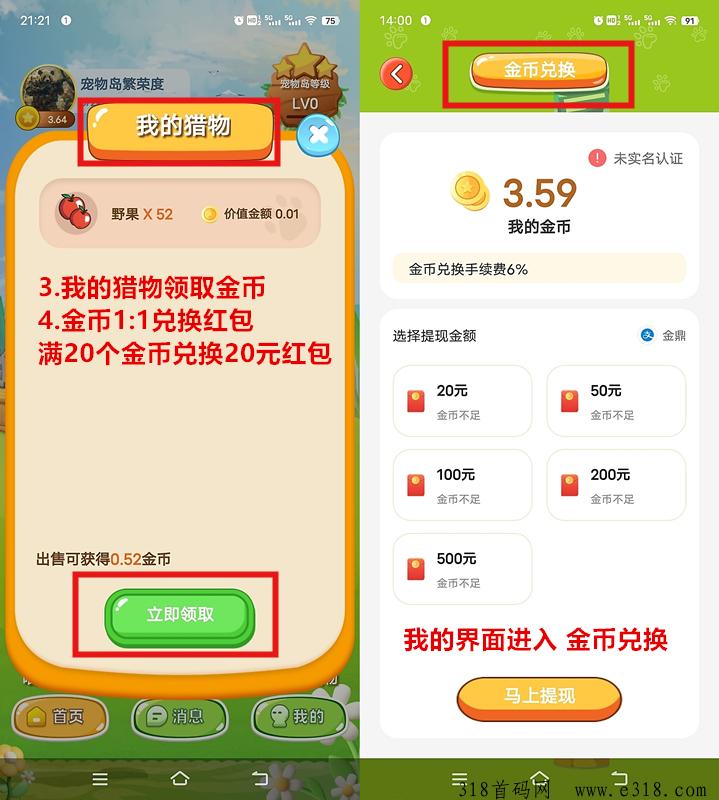 四、我的→金币兑换(1:1兑换红b变现)