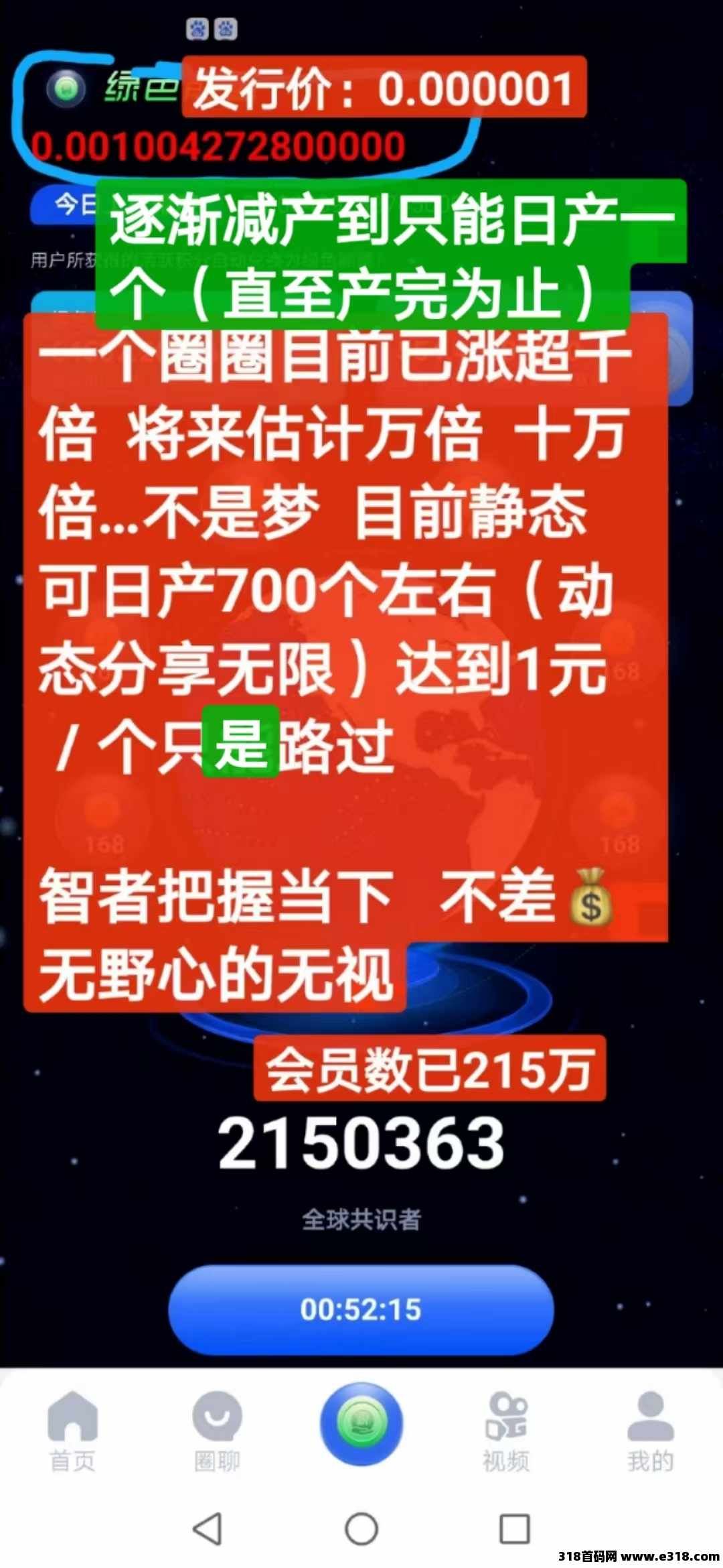 目前一天**可产700左右个数字资产 动态无限 大佬们预测很快將达到1元/个 很快折半减产 逐渐减产到只能日产1个