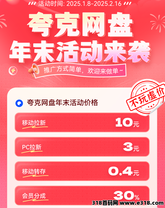 2025“开门红”,夸克网盘拉新价格全新调整,移动拉新从常规的一单7元变成10元,pc端拉新常规价从2元上升到了3元,移动转存常规价活动价格0.4/元。2025收益提高25%-30%!