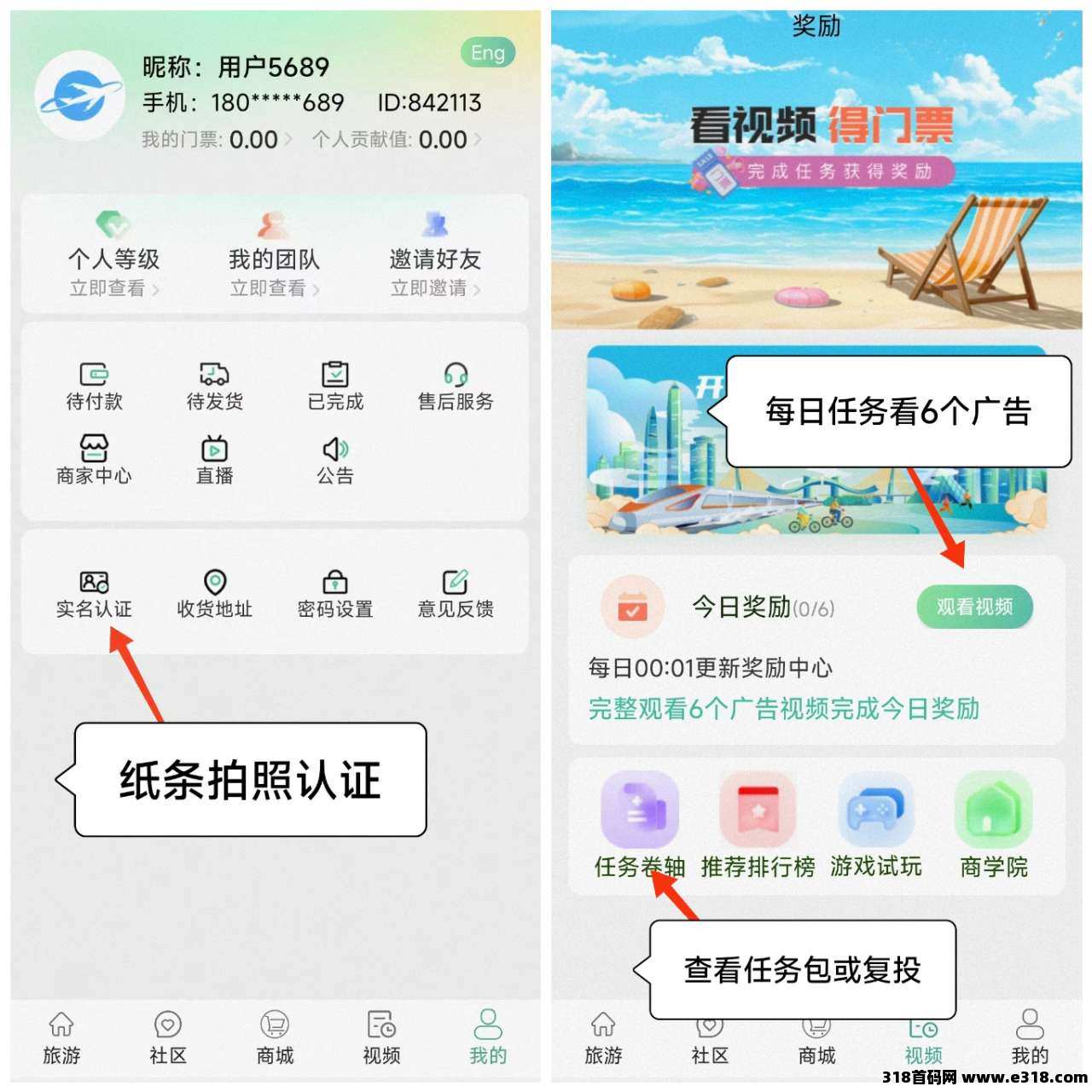 免费拍照实名,送任务包,月产12个,每天看6个广告。