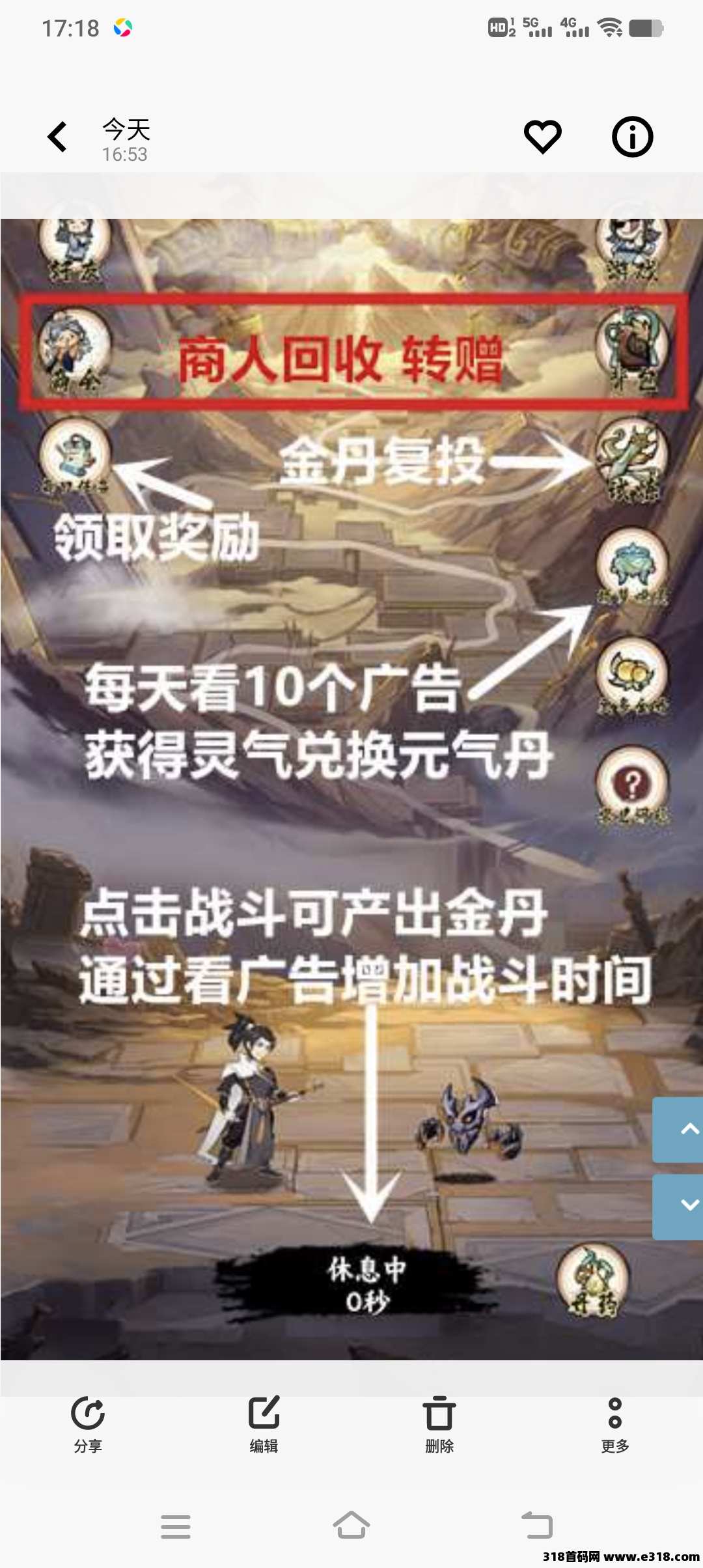 【奇兵记】看广告挂机打怪,看一个广告挂机2小时,一天平均1金丹=2米