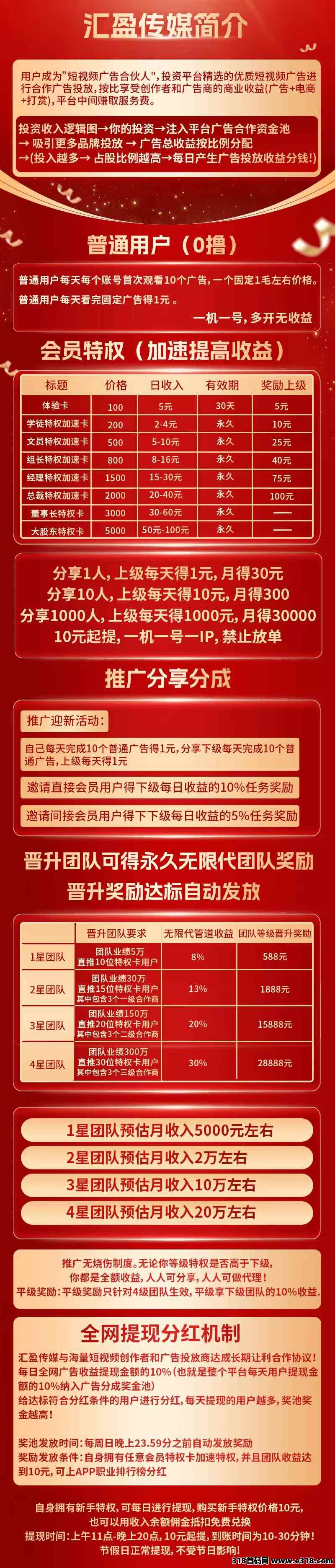 二星:直推15个会员,团队30W业绩,团队收益13%,再奖励1888元三星:直推20个会员,团队150W业绩,团队收益20%,再奖励15888元四星:直推30个会员,团队300W业绩,团队收益30%,再奖励28888元以下是实测数据:一星月收益5000+二星月收益2W+三星月收益10W+四星月收益20W+