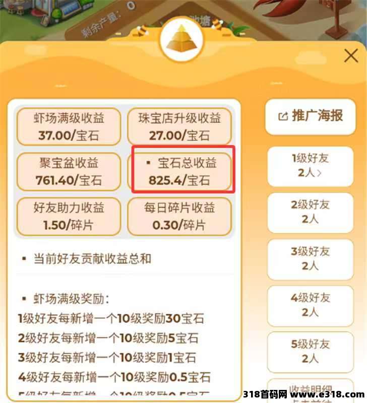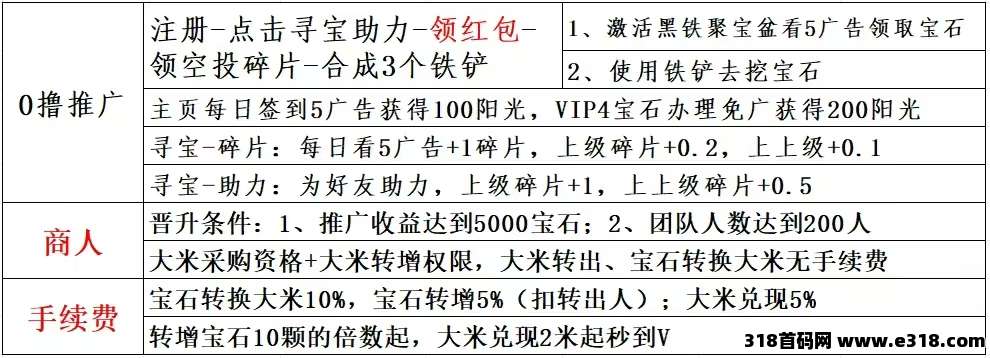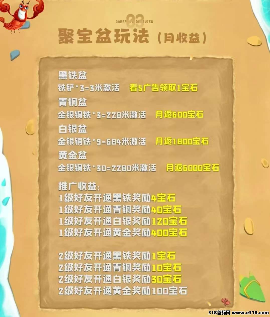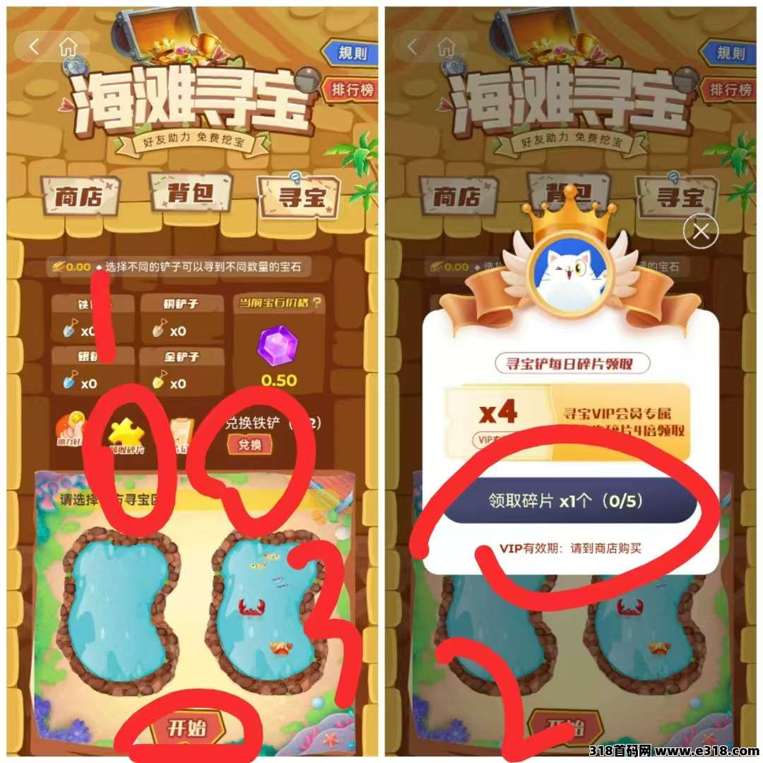 点右侧寻宝-领取空投-领取碎片-合成3个铁铲-开启黑铁盆,每日领取1宝石+0.5碎片,宝石0.5元1个
