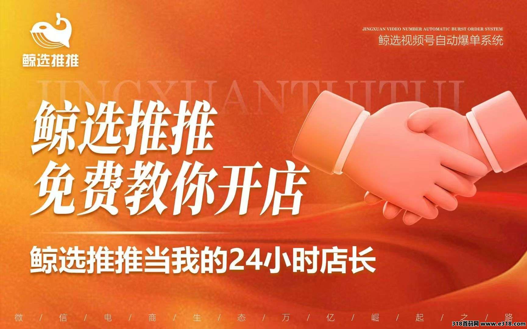 想在视频号轻松赚钱吗?鲸选推推帮你实现!0粉丝、0直播、0剪辑、0囤货,只要开通橱窗,就能开启爆单之旅!系统自带流量密码,上手快、出单猛,普通人也能轻松日进斗金。现在加入,还有全流程线上、线下专业指导,手把手教你从引流到出单。别再犹豫,抓住机会,下一个爆单的就是你!