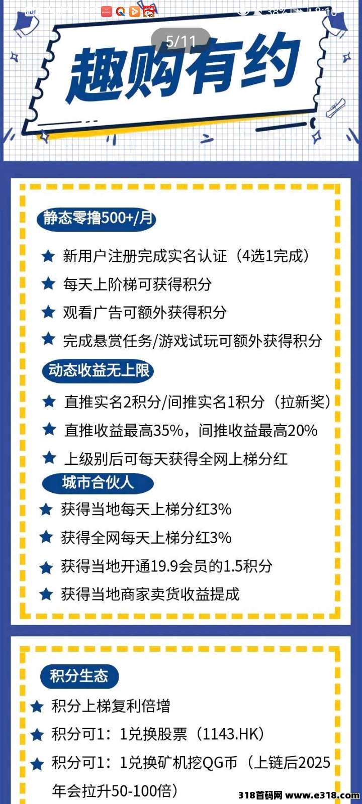 趣购有约零撸党必备项目,每天参与上梯不用看广告,5积分即可卖出,月底或者5月初上矿机!