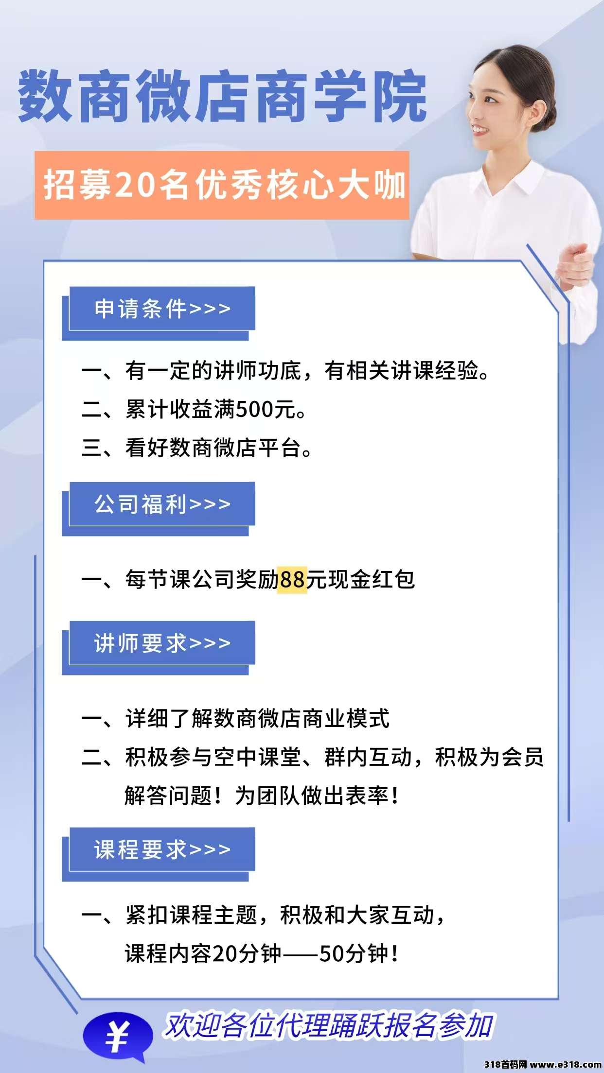 | 免责声明:合作之前建议签订合同,318首码网作为信息共享平台无法对信息的真实性及准确性做出判断,不承担任何财产损失和法律责任,若您不同意该提示,请关闭网页且不要在本站拓展任何合作,否则造成的任何损失由您个人承担。 | |