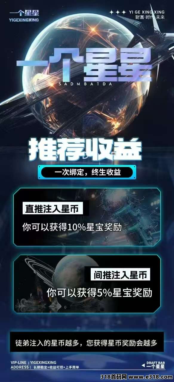 2025年跨年黑马项目震撼来袭!实名认证即送永久200算力,每日稳定产出0.6枚币,财富积累从一颗星星开始! “搬砖+**+算力矿池+星神+NFT”五大核心玩法,多重收益路径引爆你的资产裂变,控盘机制严格护航,生态闭环稳如磐石!