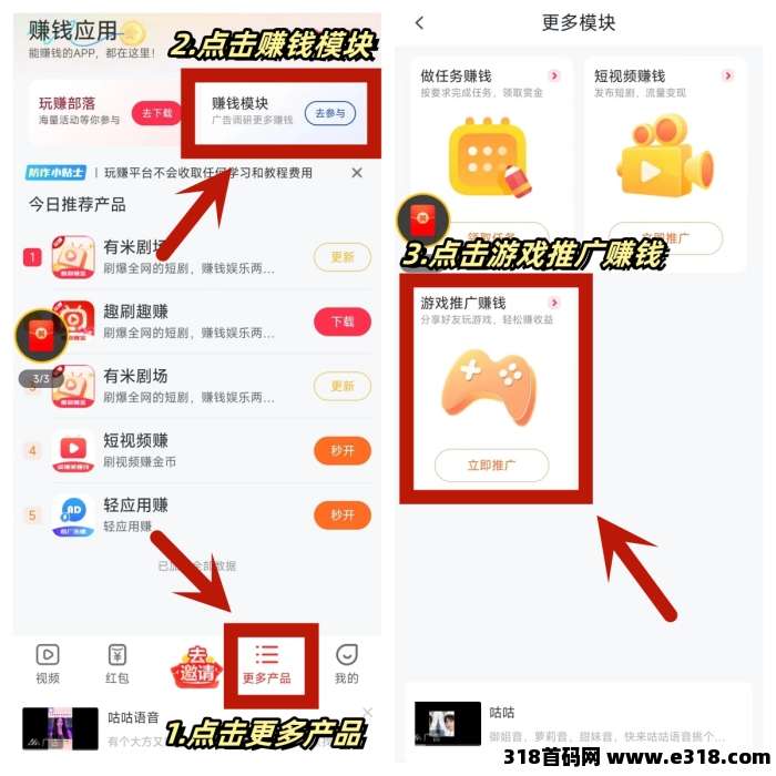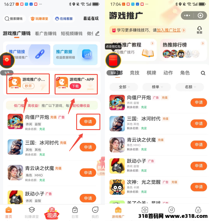 在玩赚红包APP【首页】,找到“更多产品-赚钱板块-游戏推广”玩赚账号同步登录,账号信息数据同步;